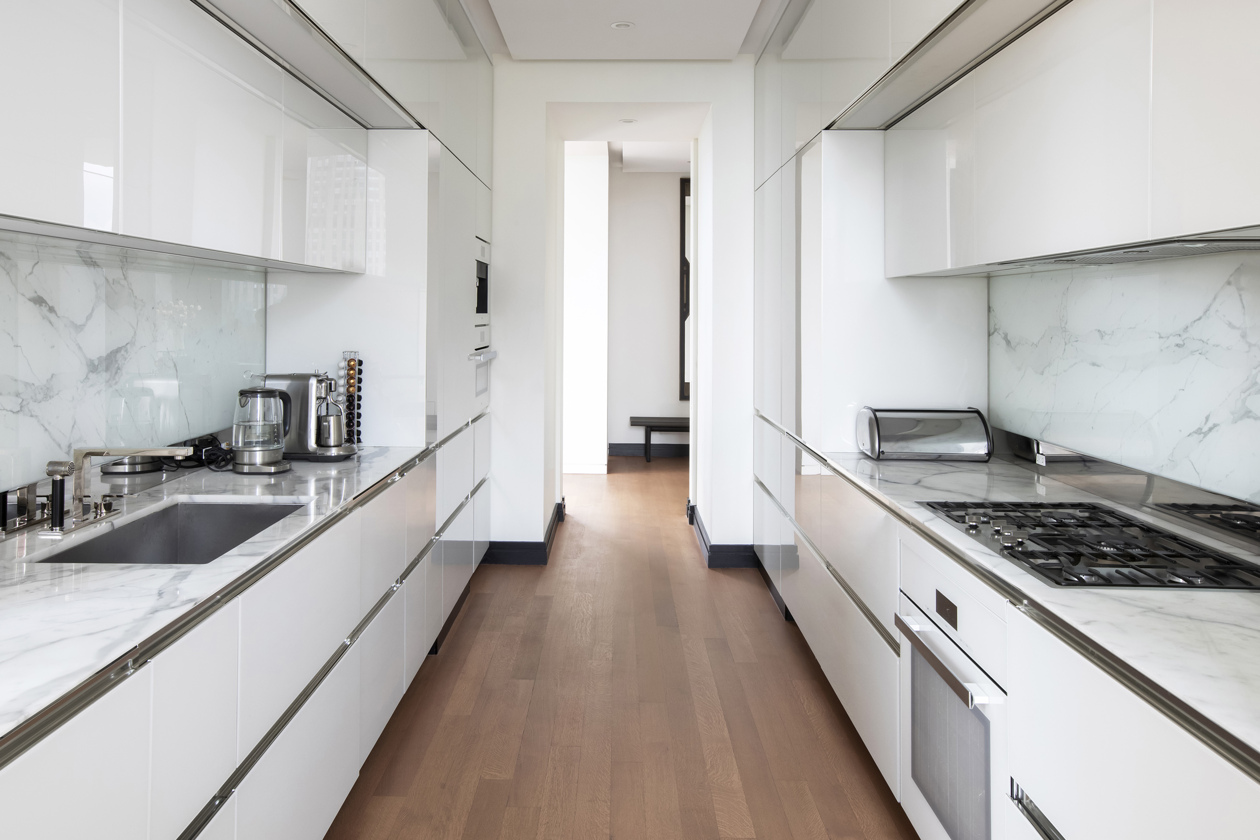 Despont’s interior vision, rooted in a palette of oak, marble, and bronze, is elevated by Molteni&C’s bespoke craftsmanship. The kitchen is defined by white marble countertops and backlit backsplashes, paired with back-painted glass doors framed in aluminum — a material dialogue that echoes the tower’s crystalline geometry and ever-shifting reflections.
