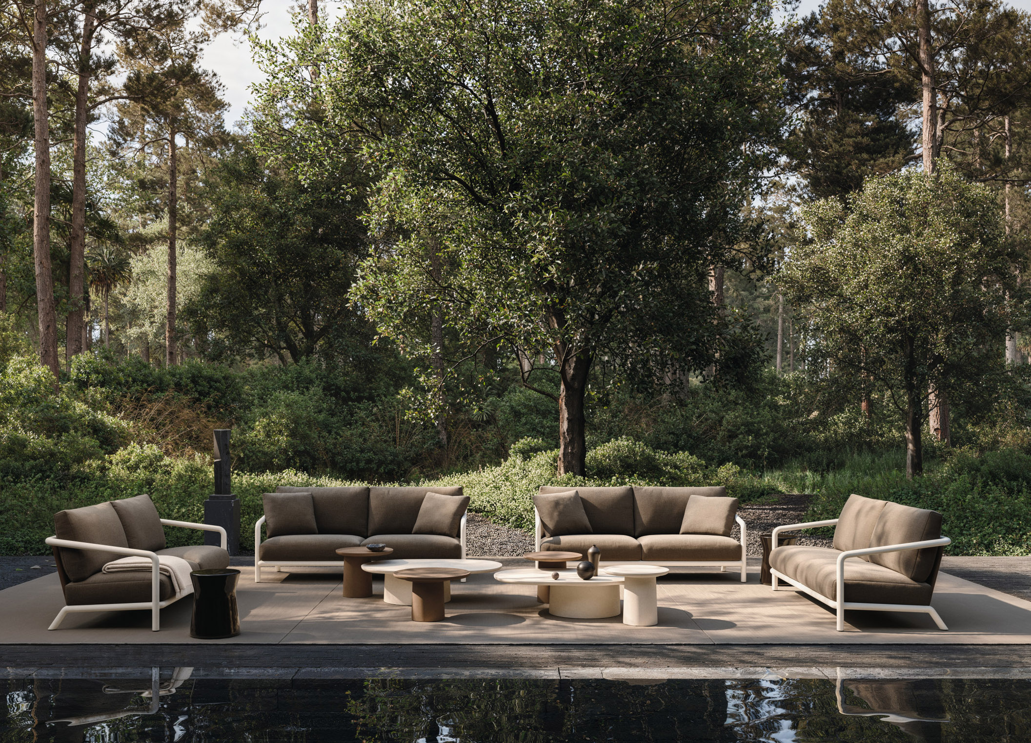The Louisa Outdoor coffee tables by Vincent Van Duysen carry the same dialogue between material and form as their indoor counterparts, reinterpreted for life in the open air. Crafted from weather-resistant wood and reinforced cement, the collection preserves Van Duysen's signature refined contrasts in a design built to endure the elements — offering a sculptural contemporary centerpiece for elegant terraces, courtyards, and garden settings.