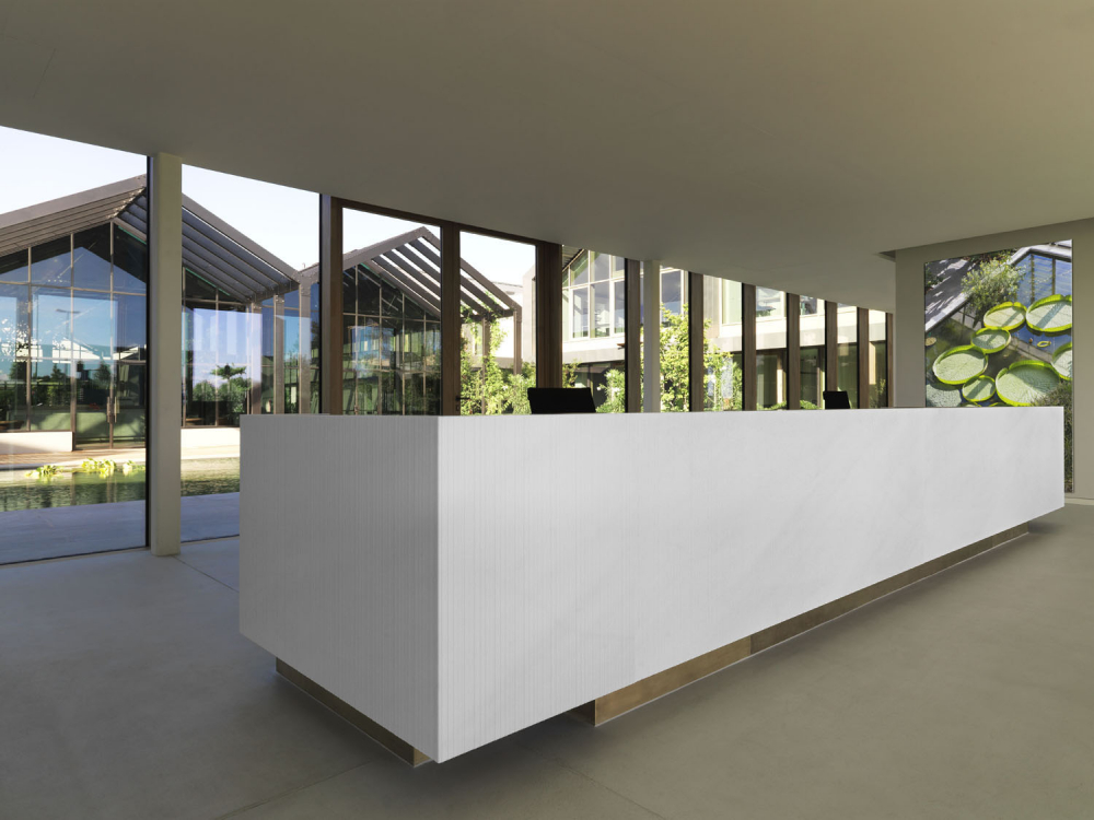 The inspiration that guided the stylistic definition of the interiors was born from the wish of combining the values of participation and sharing with the aesthetic enhancement of the work environment. The welcoming and personalized spaces, a far cry from the traditional “corporate” image, evoke living places in which formal and aesthetic choices harmonize with functional needs. White, with some bronze hints, is the dominant colour of these simple and linear environments.