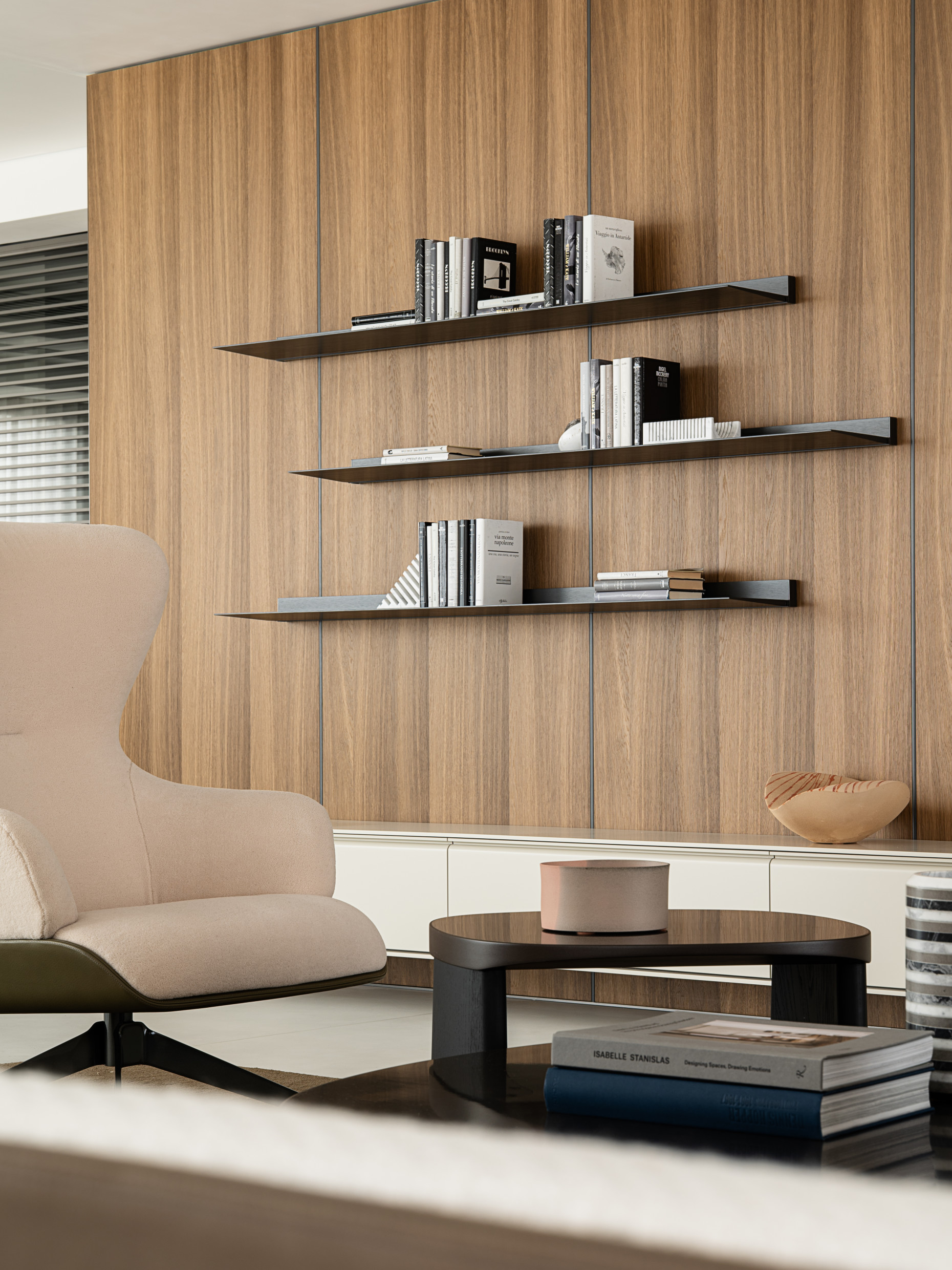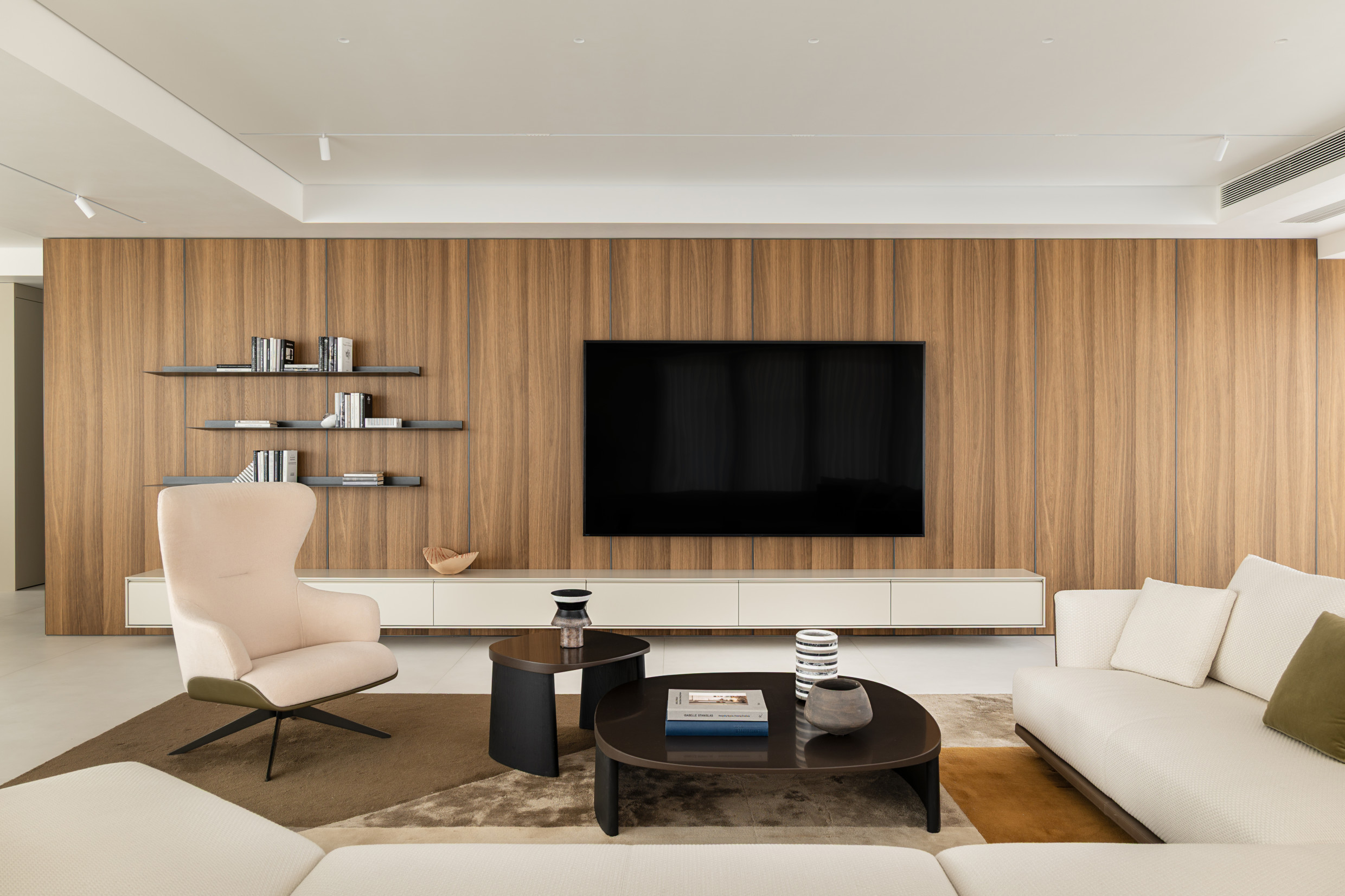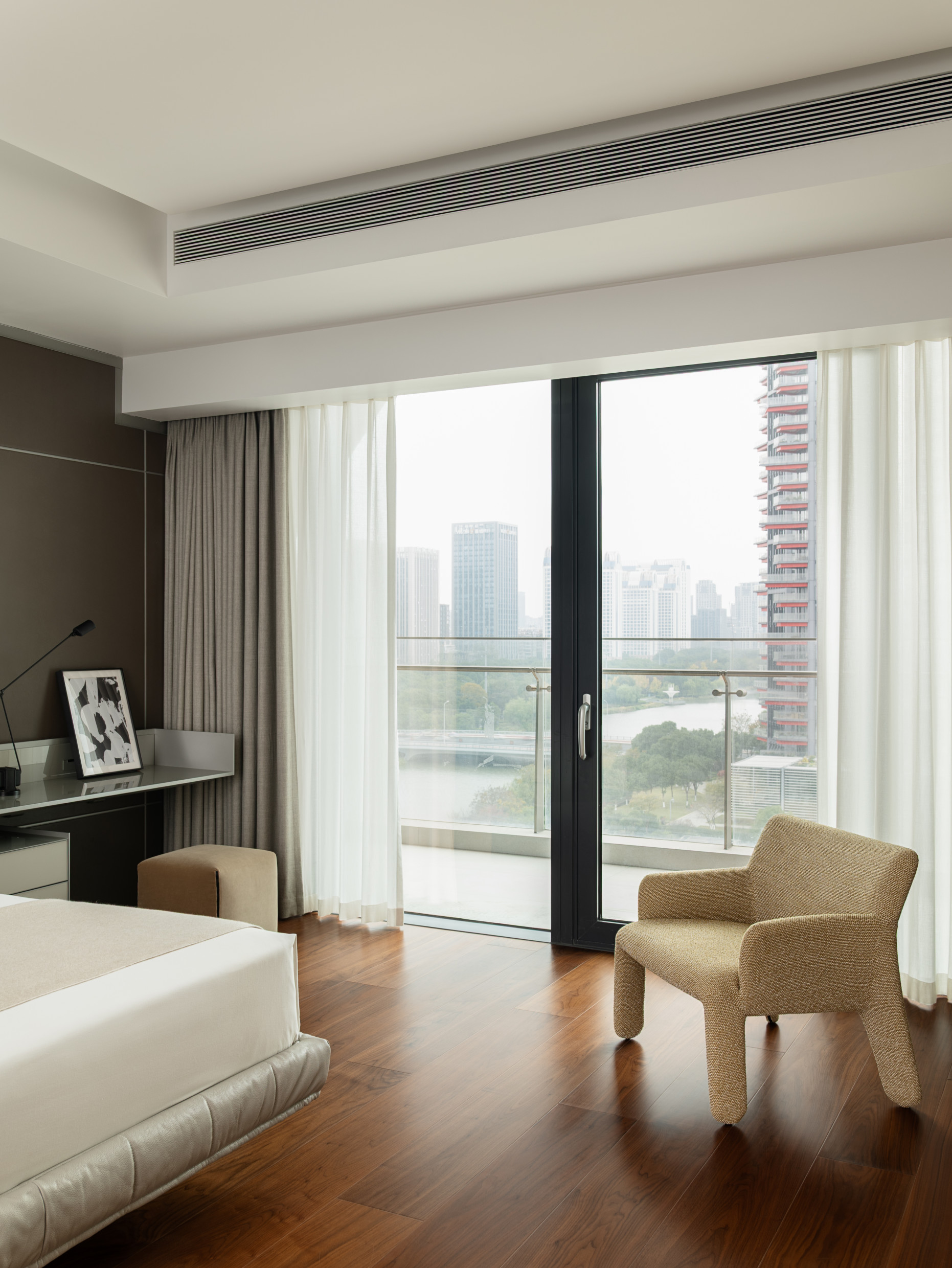 In the living room, the Cleo sofa and Cleo coffee tables by Vincent Van Duysen create a seamless synergy with the building’s exterior and the upscale character of the Yinzhou District.​ The modular sofa offers endless possibilities and is easily arranged around the coffee table, a domestic sculpture crafted from Eucalyptus, Black Oak and Sunrise Oak, encapsulating Van Duysen's meticulous attention to detail. The Arial boiserie by Studio Klass serves as an elegant backdrop for the entire space.