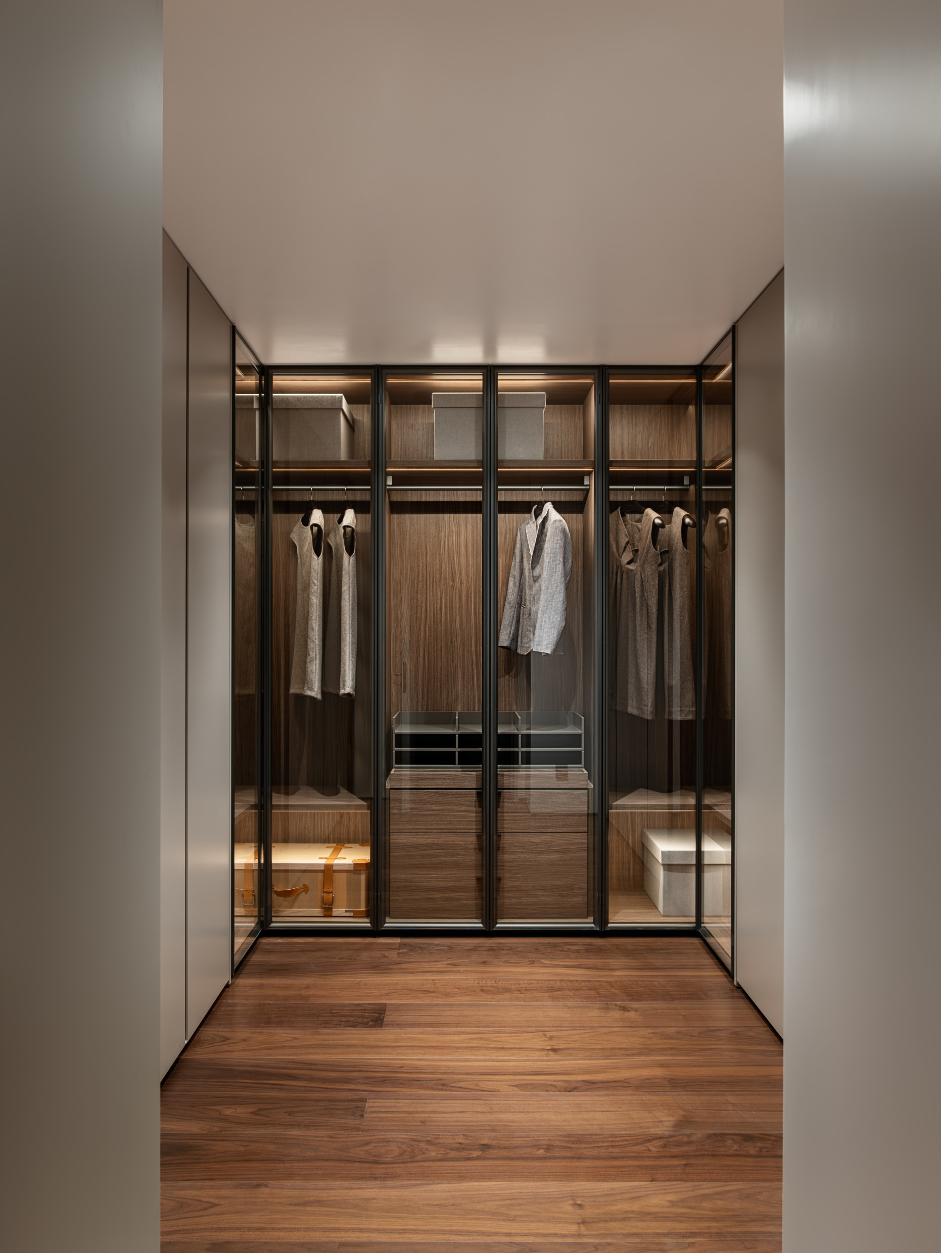 In the bedroom, the Gliss Master wardrobe system by Vincent Van Duysen redefines storage, offering a wide selection of doors, accessories, and finishes, to create an entirely unique and personalized environment. The frame structure is envisioned with elegant eosin across the front of the frames and shelves, creating a magnificent harmony with the metallic rigor of pewter and bronze, an expression of refined taste and attention to detail.
