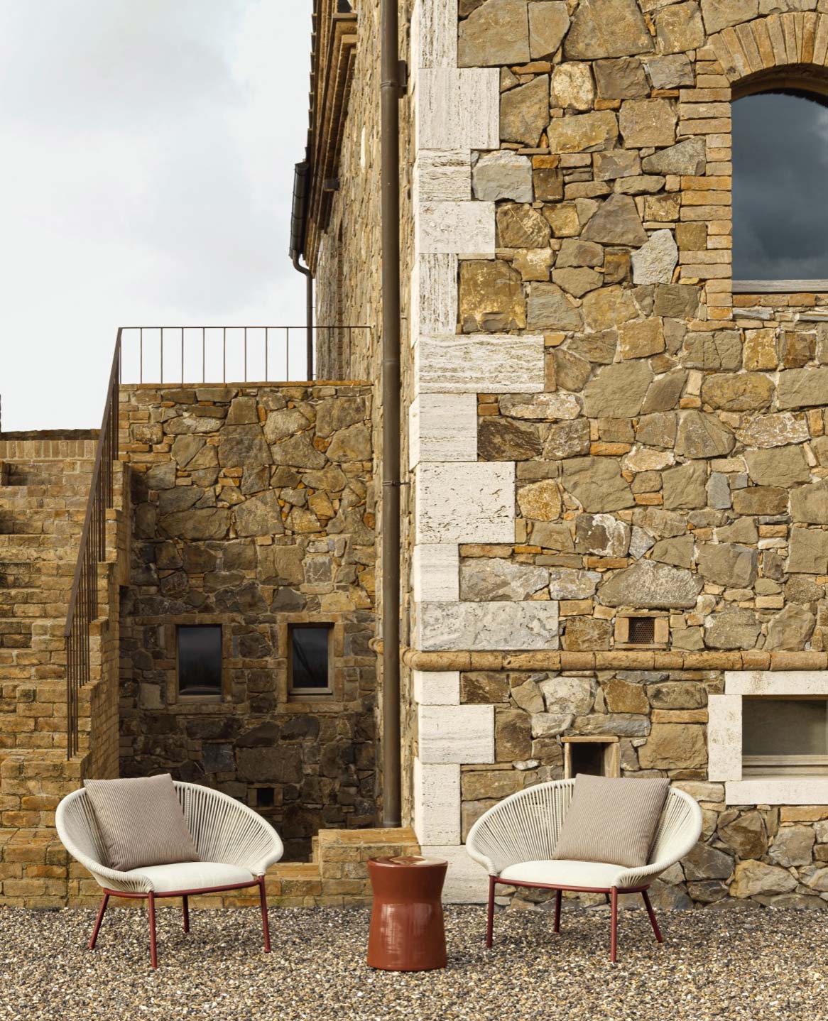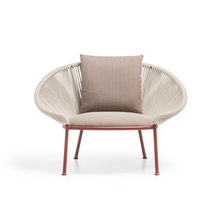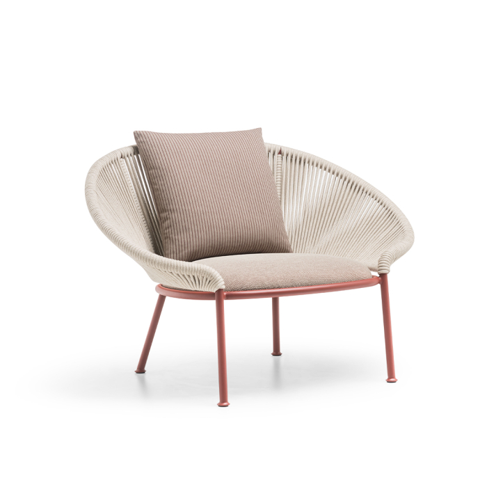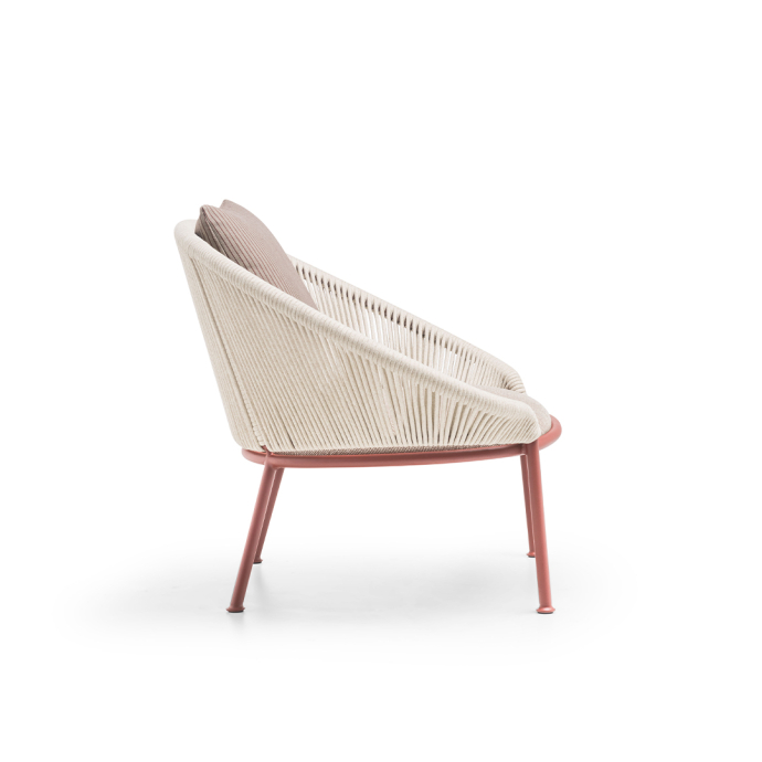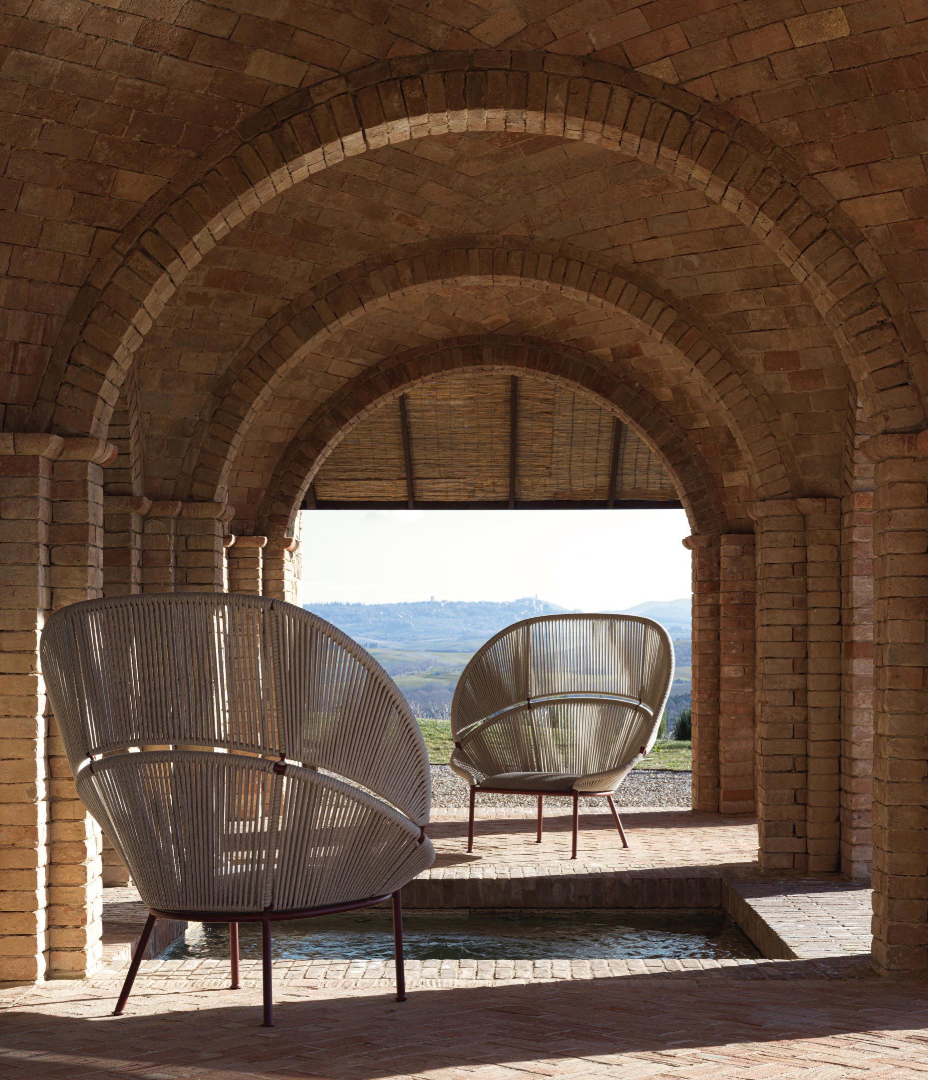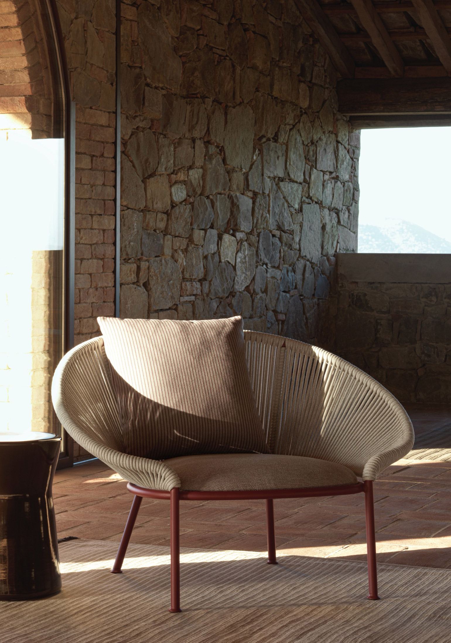 靠背有高低两种款式,聚丙烯纤维丝带像作画一样在此编织图案。这些绳索会让人联想到航海元素,在防水和耐恶劣气候的同时,还增添了一丝优雅。