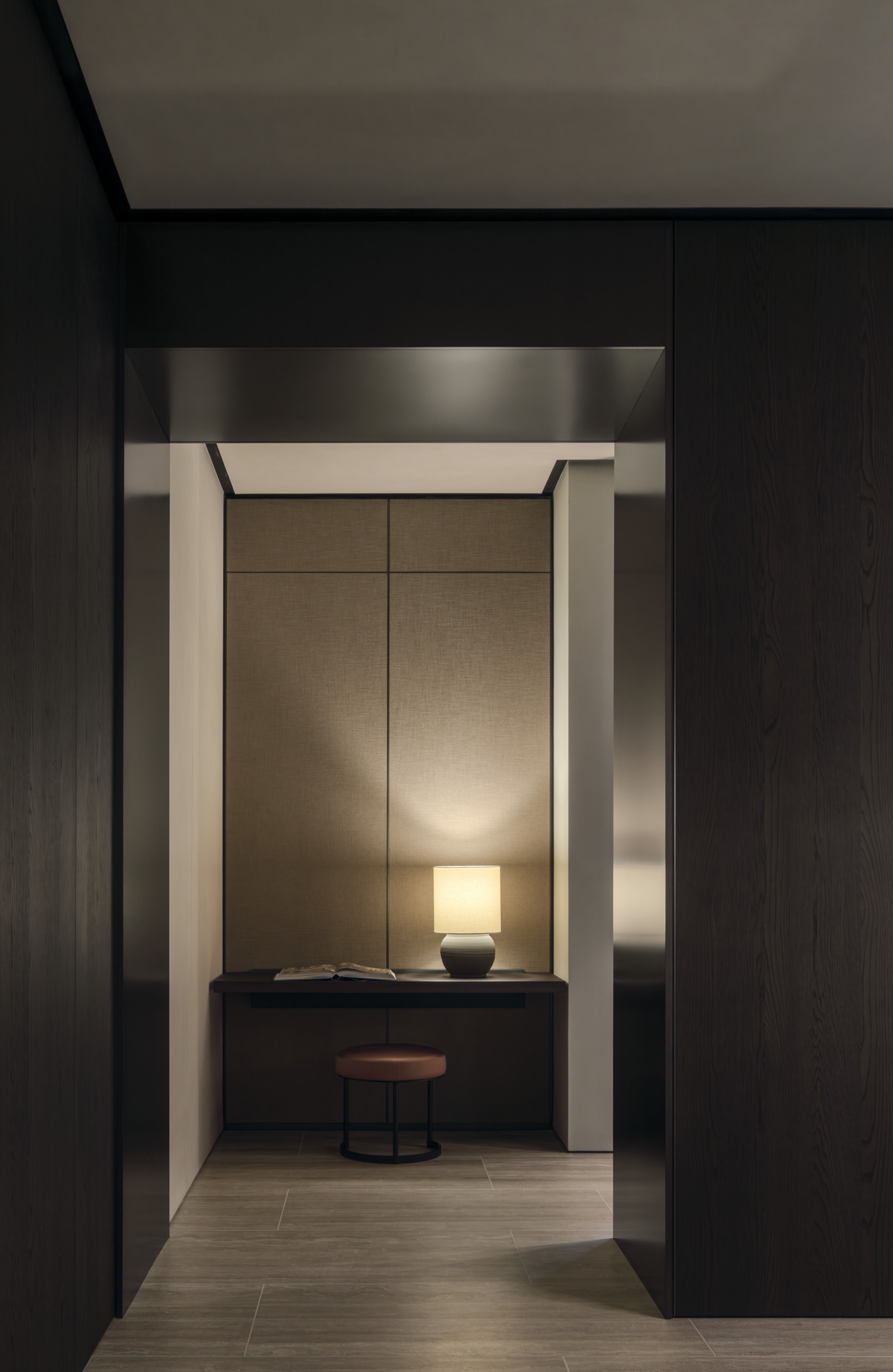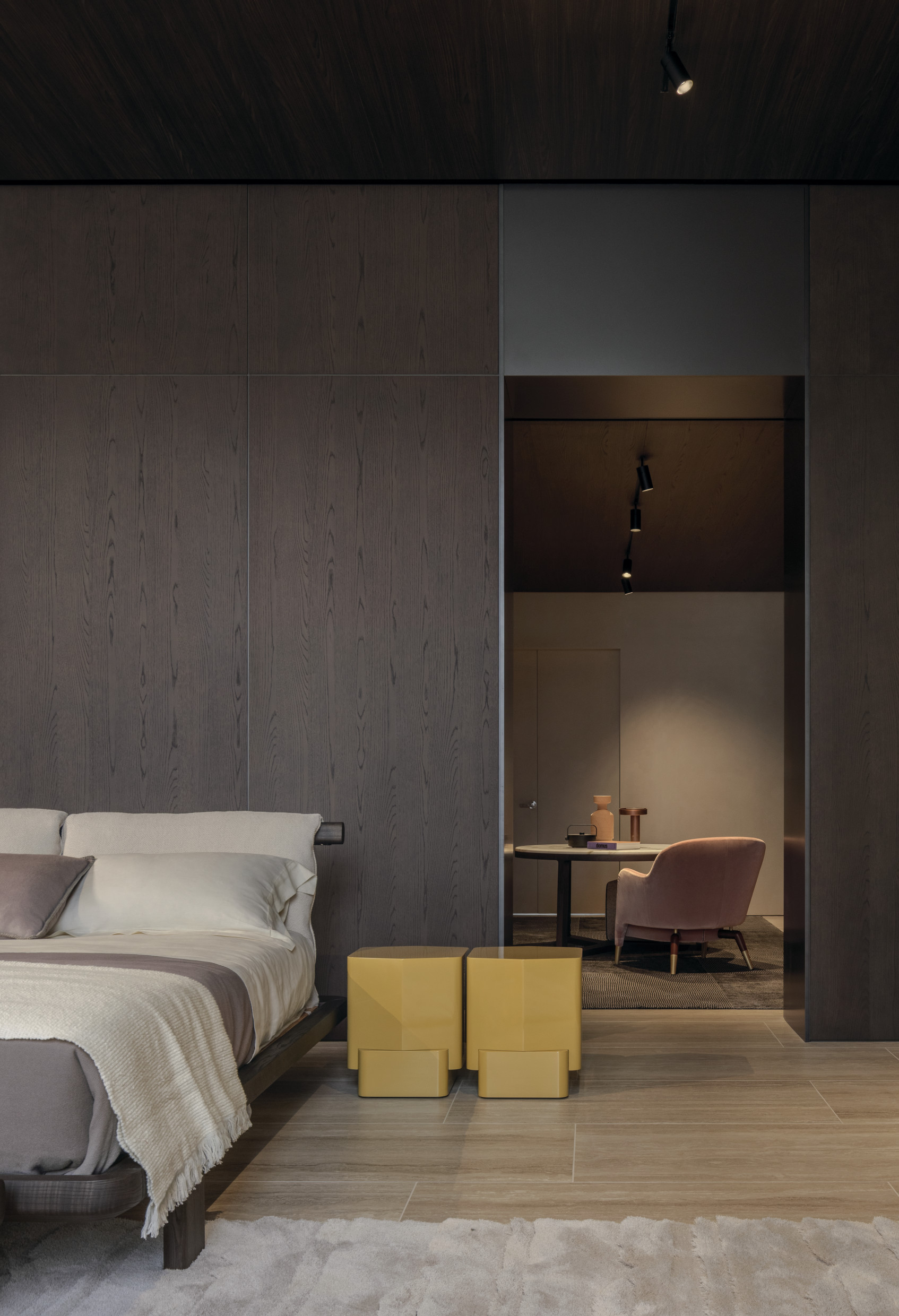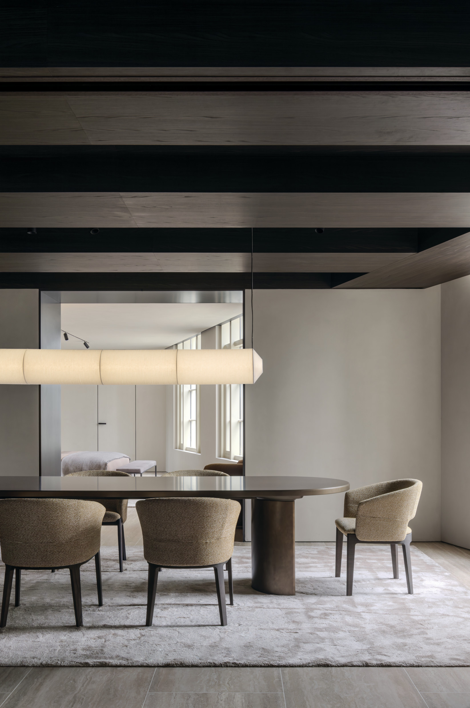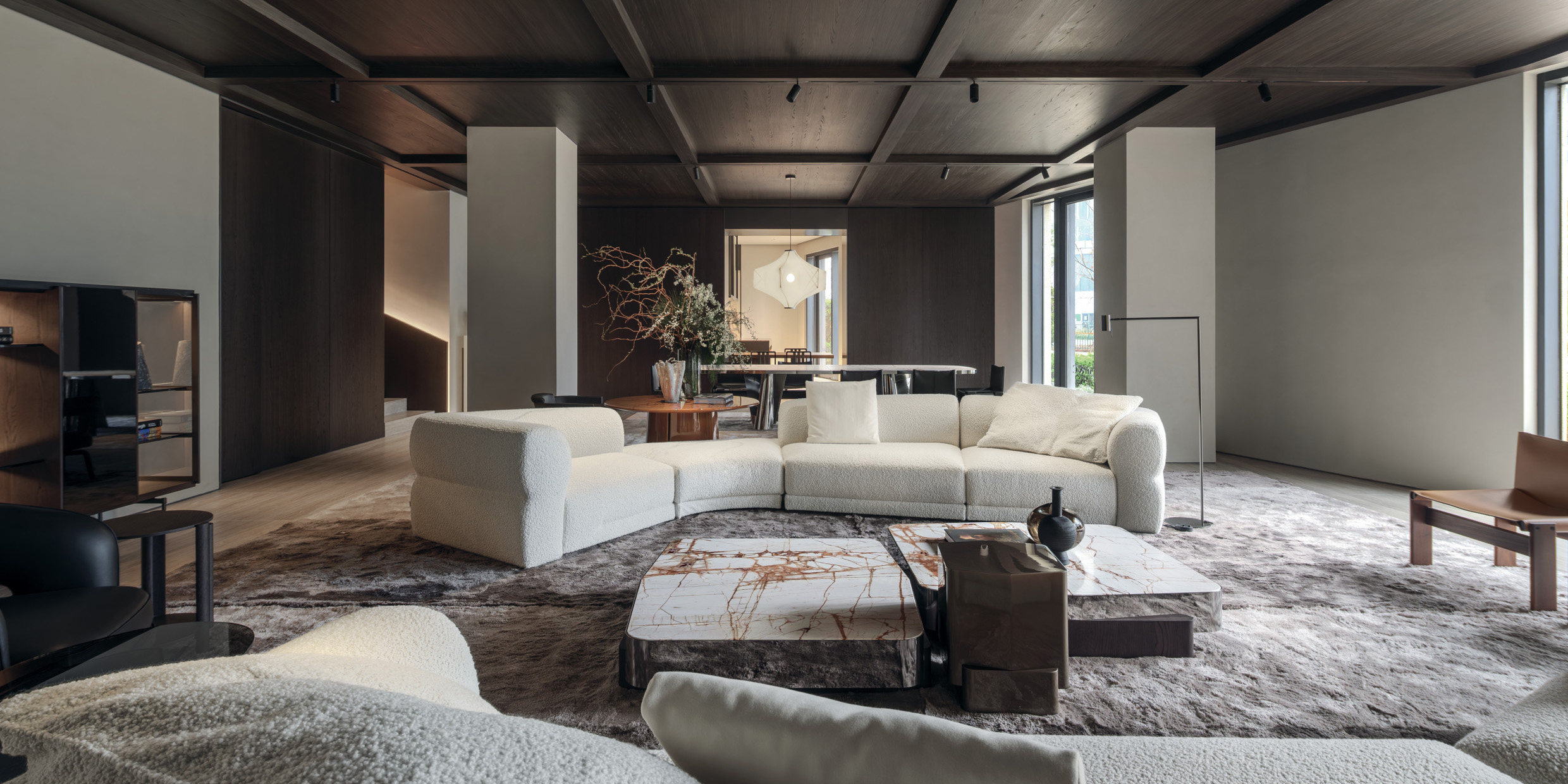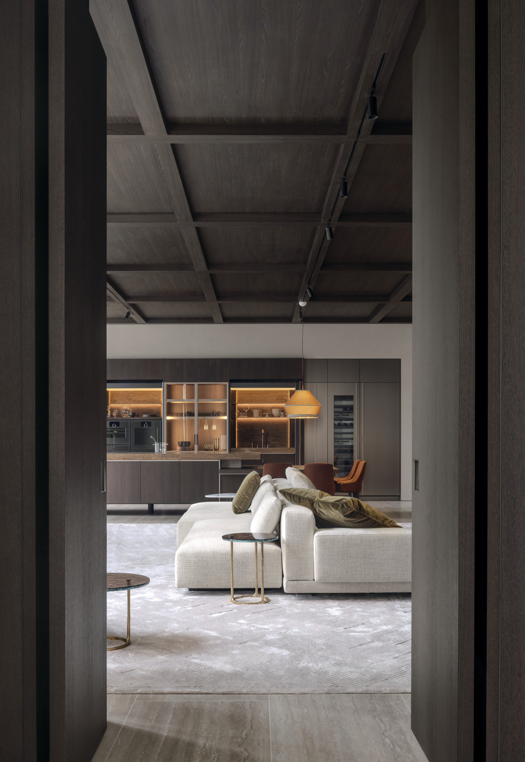 Upon entry, guests are greeted with living and dining areas, multiple kitchen compositions, and bedroom spaces — offering inspiration for every part of the home. The immersive layout reflects an inviting atmosphere with a harmonious blend of rich materials is featured throughout. Wood introduces warmth and depth to the space, while the use of travertine adds texture and sophistication, together creating a refined, contemporary aesthetic.