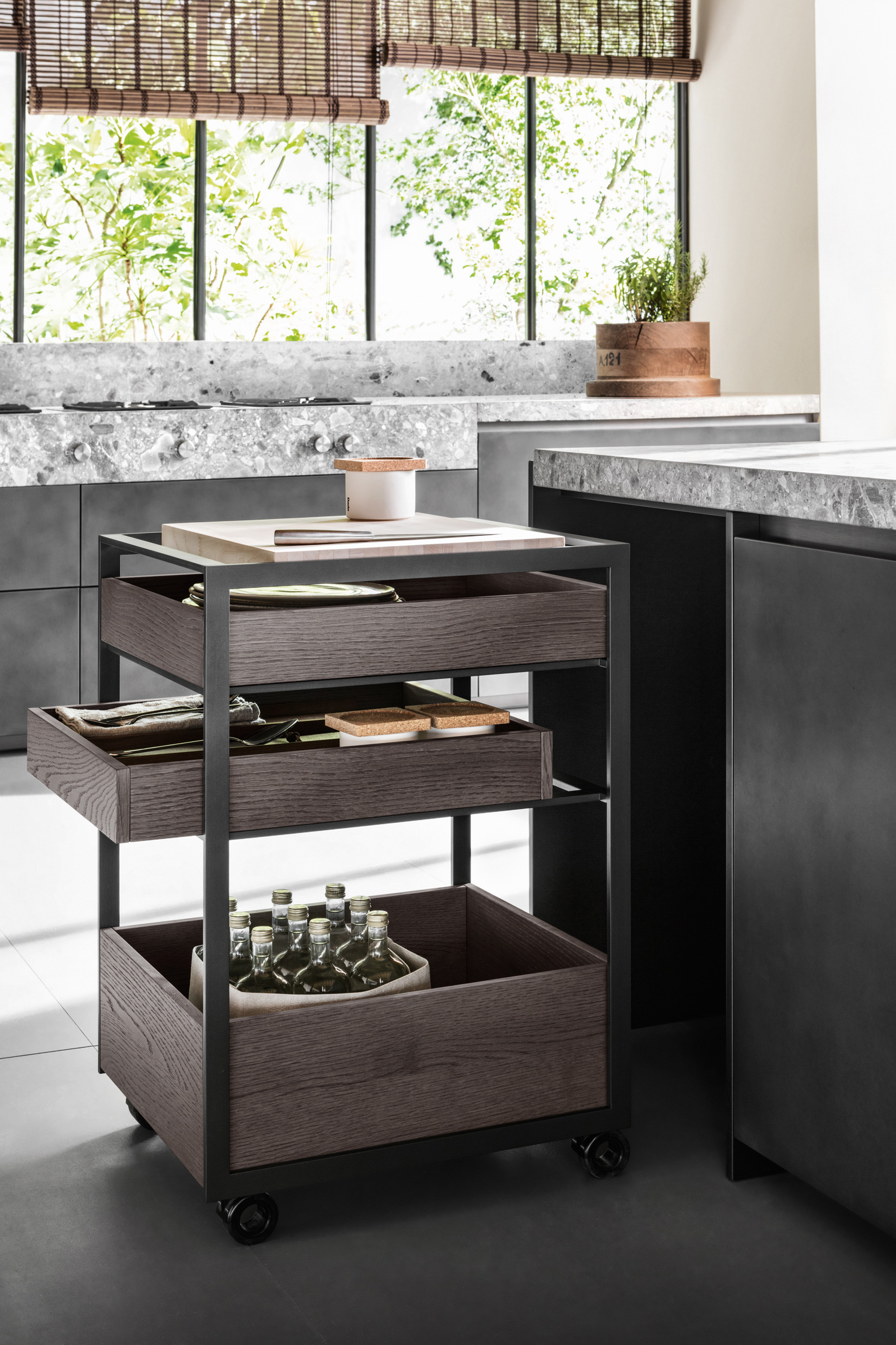 “Ceppo” der Küchenwagen ist eine regelrechte Zubereitungsinsel im Dienste des Kochs/der Köchin und ist mit oder ohne Räder lieferbar, um sich an die tagtäglichen Bedürfnisse aller Wohnlösungen anzupassen.
