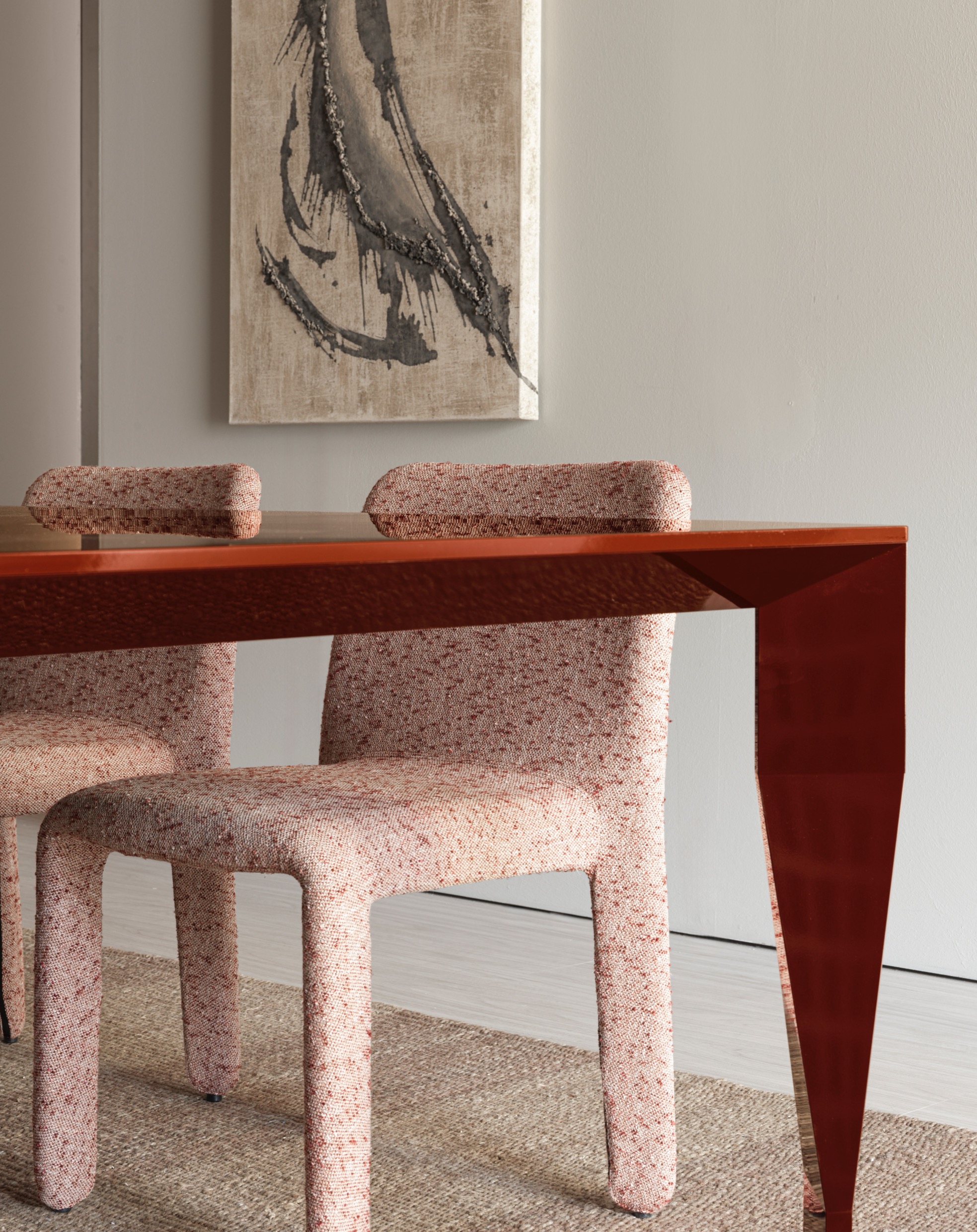 Eine Tischserie mit abgewinkelten Beinen, die sich wie ein zartes Origami gestalten und sowohl viereckig als auch rechteckig lieferbar sind.