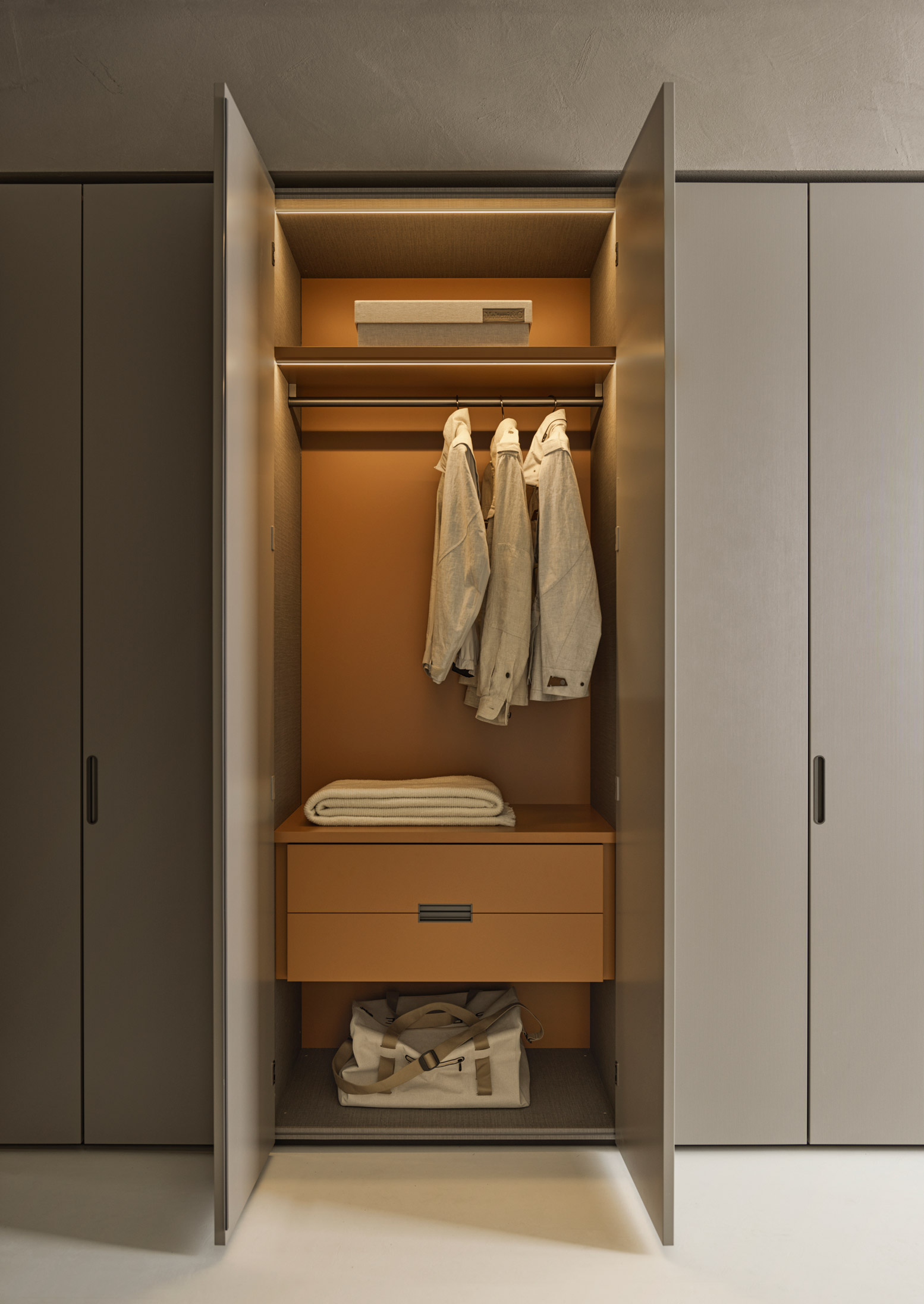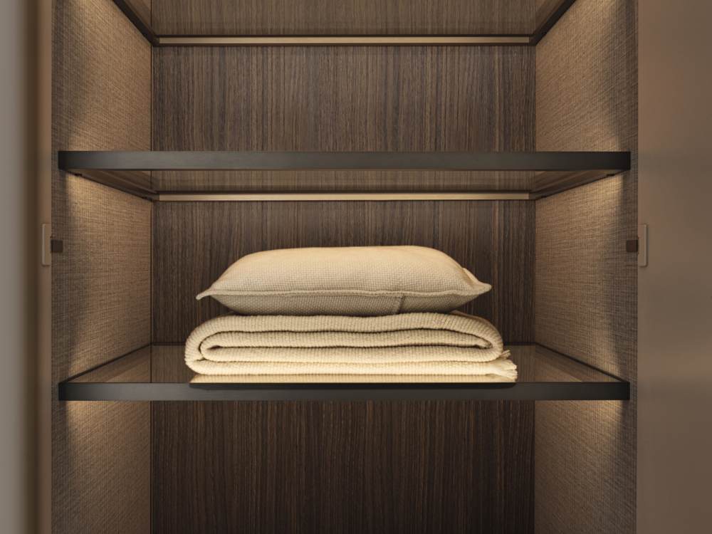 Die innovative Schranktür Linear von Vincent Van Duysen, die als Ergänzung zum Gliss Master System entwickelt wurde, verleiht elegante Schönheit und spricht die intuitive Wahrnehmung an. Ihre Hightech-Merkmale, wie die einzigartigen verdeckten Scharniere und die neuen gefederten Verschlüsse, differenzieren sie von anderen Schranksystemen.