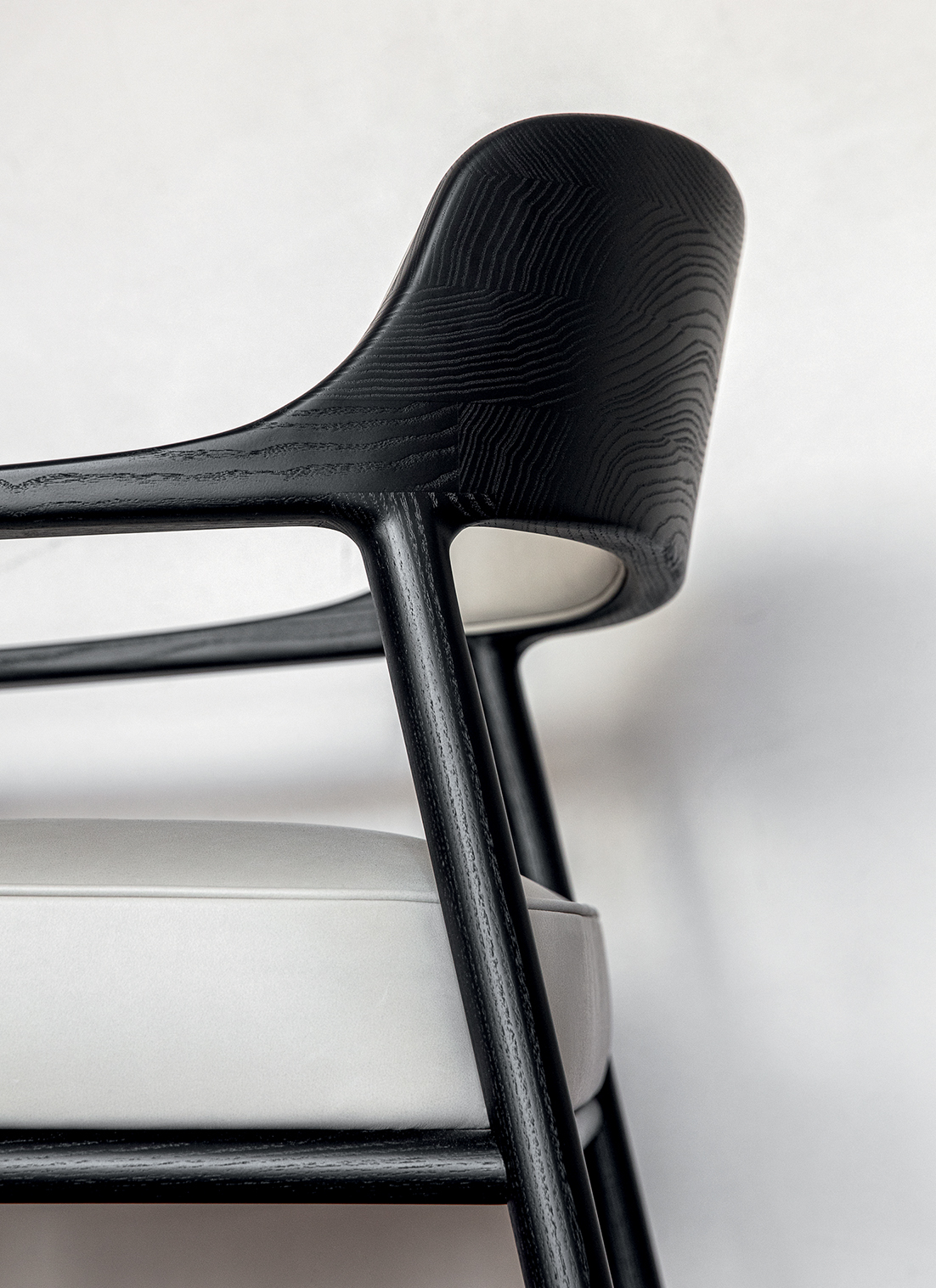 Ein Armlehnstuhl mit Gestell ganz aus Eschenkernholz, gebeizt in Eiche schwarz oder Eukalyptus, dessen Rückenlehne fließend in die Armlehnen übergeht.