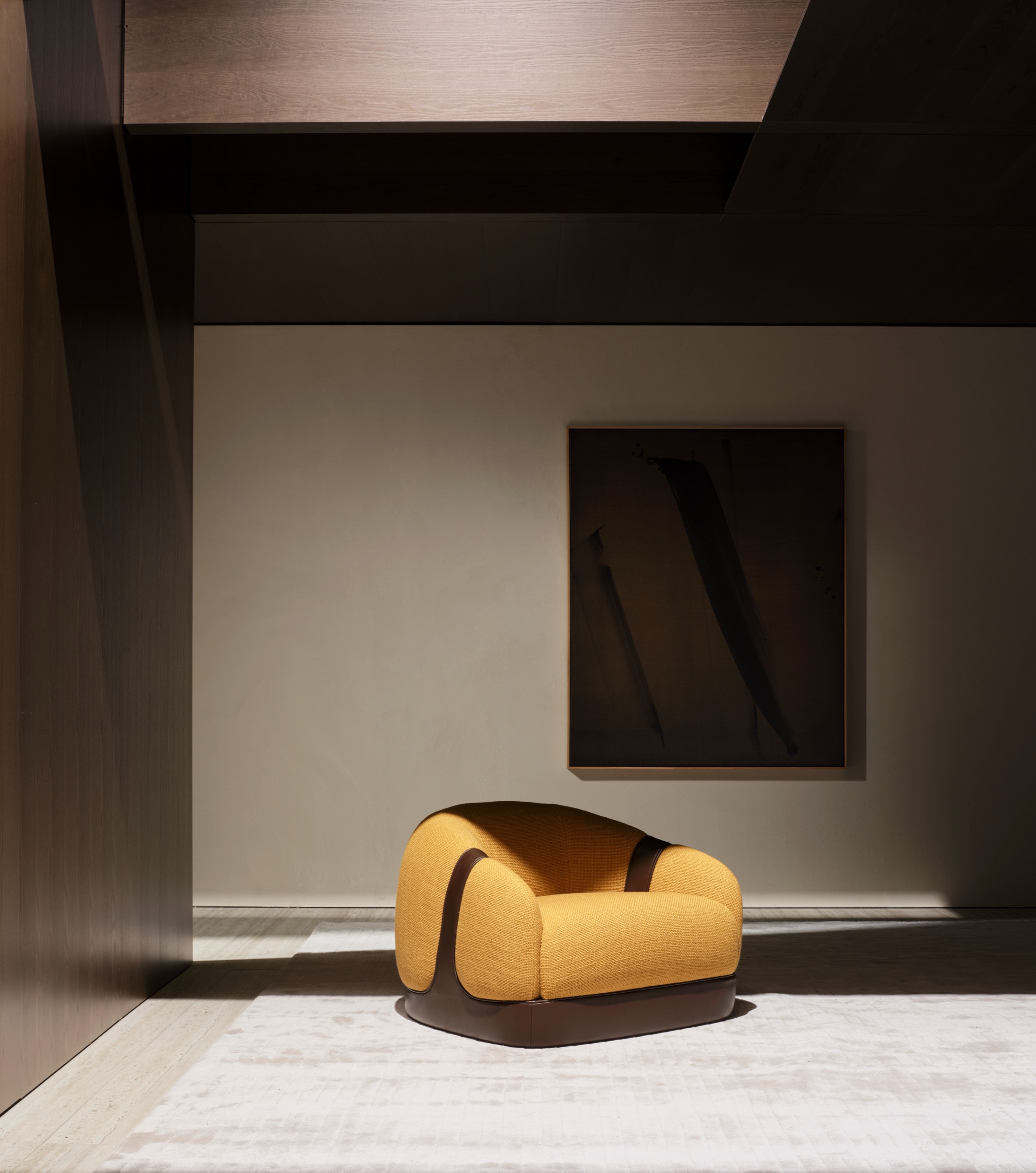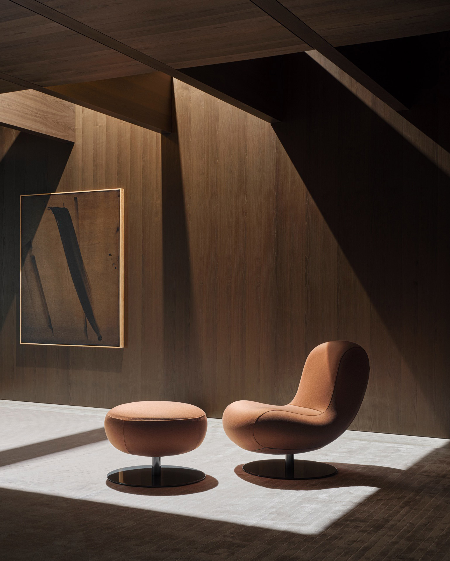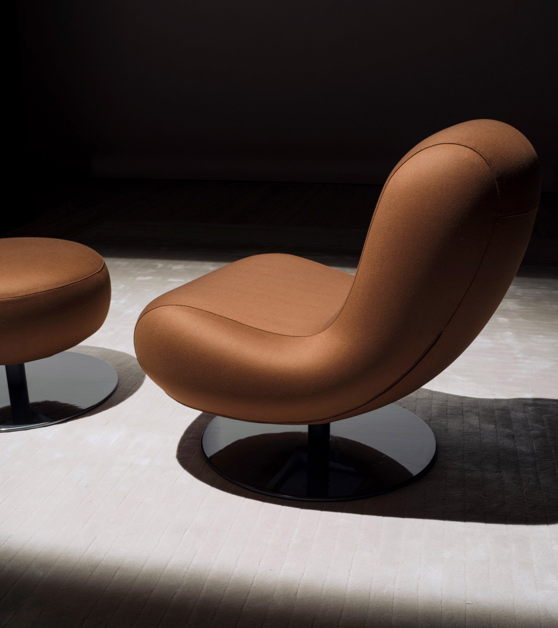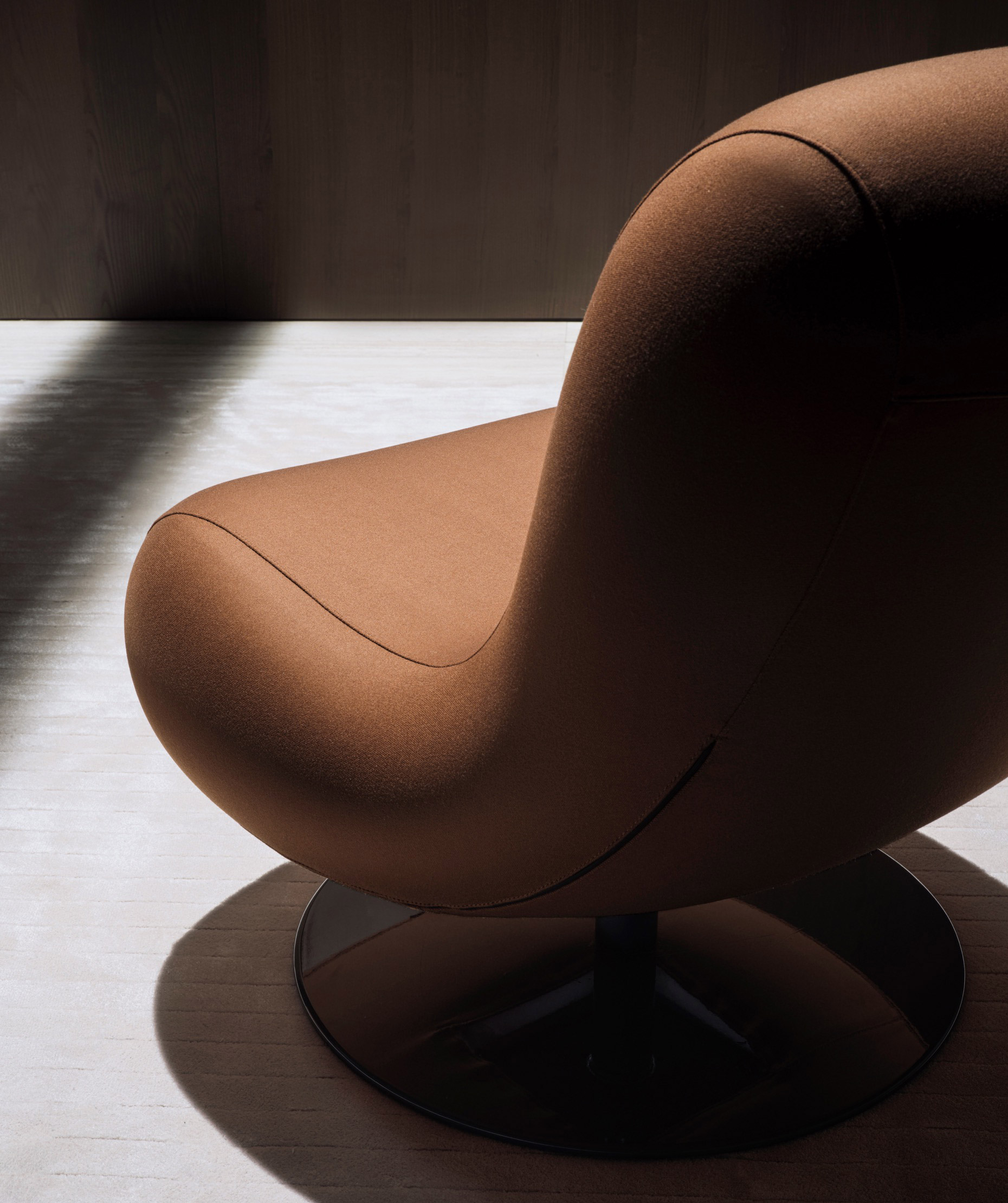 Inspired by the rolling hills of the Tuscan countryside, the Bosco armchair by Naoto Fukasawa is a distinctive yet versatile addition to the home, elegantly designed to blend into its surroundings. The swivel metal-based chair features a central supporting column and is further characterized by soft lines and comforting volumes, allowing the body to yield to its contours with trust, as if resting on the sun-warmed earth.