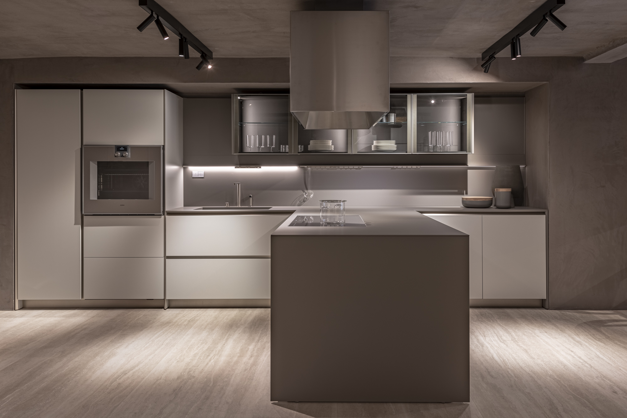 The upper floor opens into a large kitchen area featuring a modern Prime kitchen together with the Diamond table. The result is a single hub of Italian design excellence.