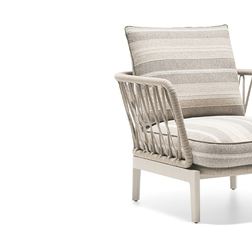 The themes that identify the Landmark Collection - the curved, enveloping lines of the solid teak frame and the macro-scale warp and weft pattern - remain in the armchair and, thanks to the more compact proportions, become even clearer and more expressive.