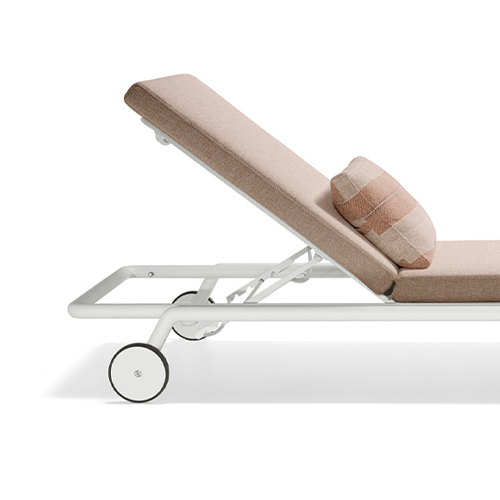 The sun sunbed, the archetype par excellence of outdoor furniture, interprets all the elements that characterise the aesthetics of the Timeout Collection, re-proposing the theme of the burnished painted aluminium band, running along the entire profile, and the traditional motif of the polypropylene rope weave.