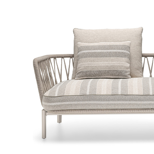 A collection with a minimal and contemporary aesthetic that interprets elements of the Mediterranean tradition: fer forgé and hand woven polypropylene rope. The sofa is available in two versions, also with two cushions, with widths of 150 and 180 cm. The use of aluminium, which weighs significantly less than iron, allows for easy movement of generously sized furniture.