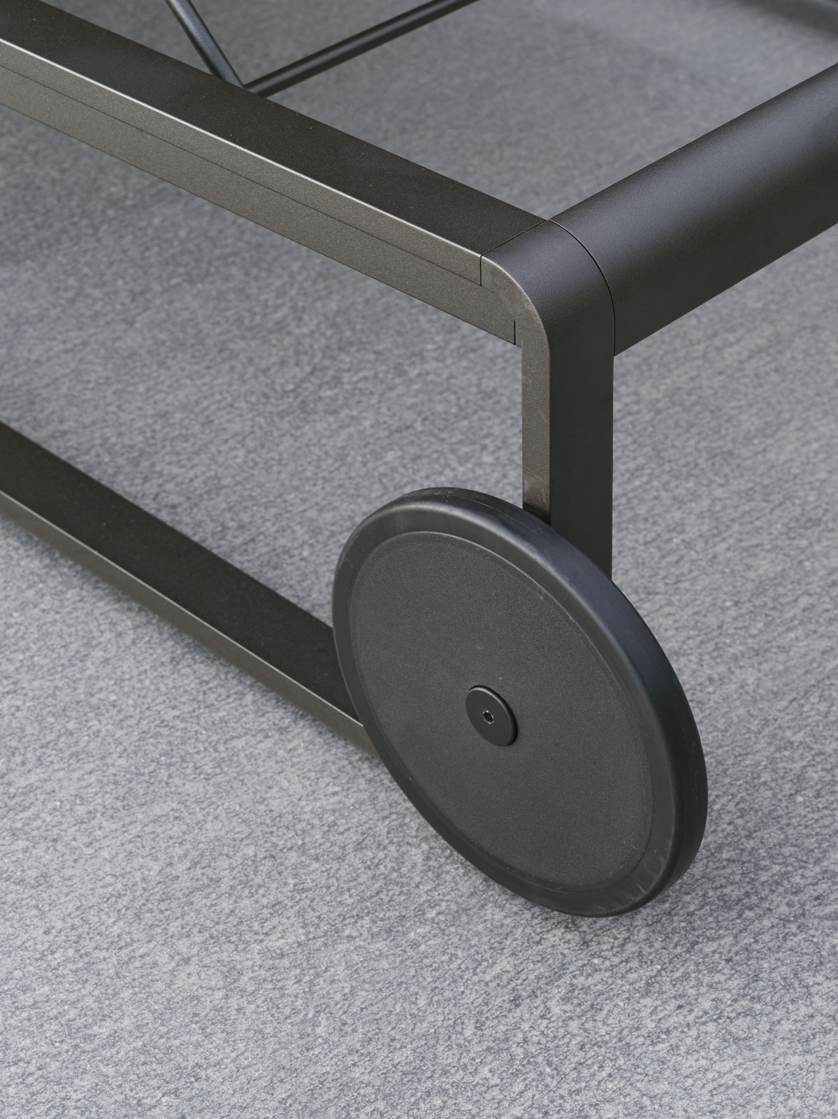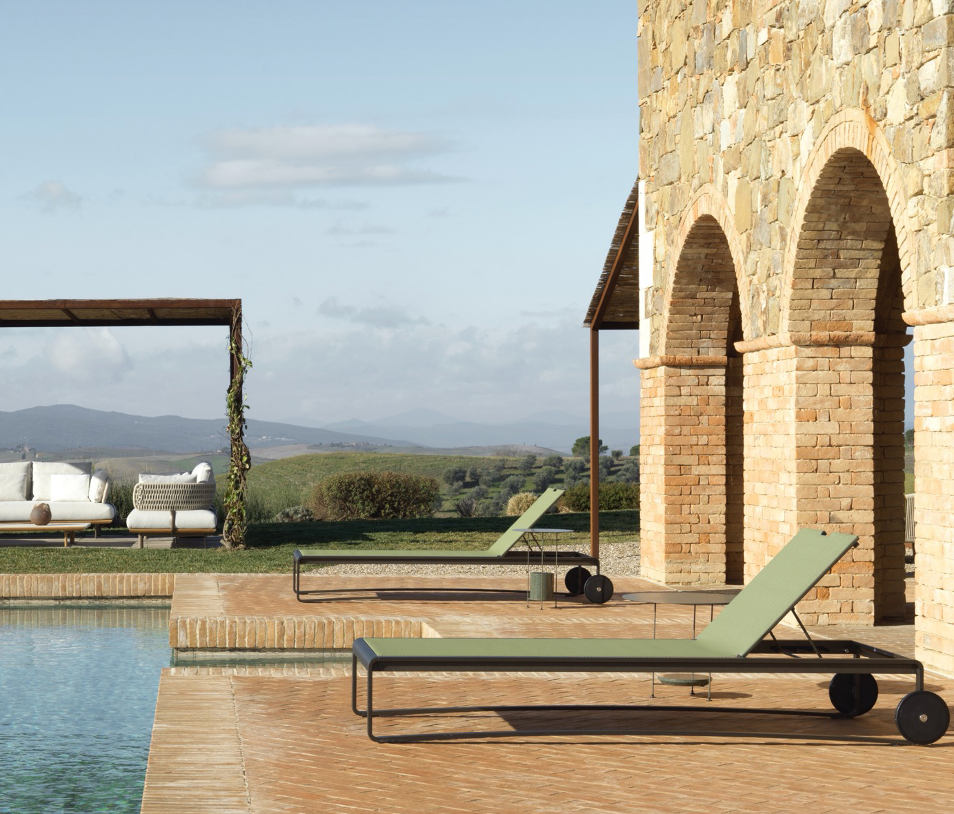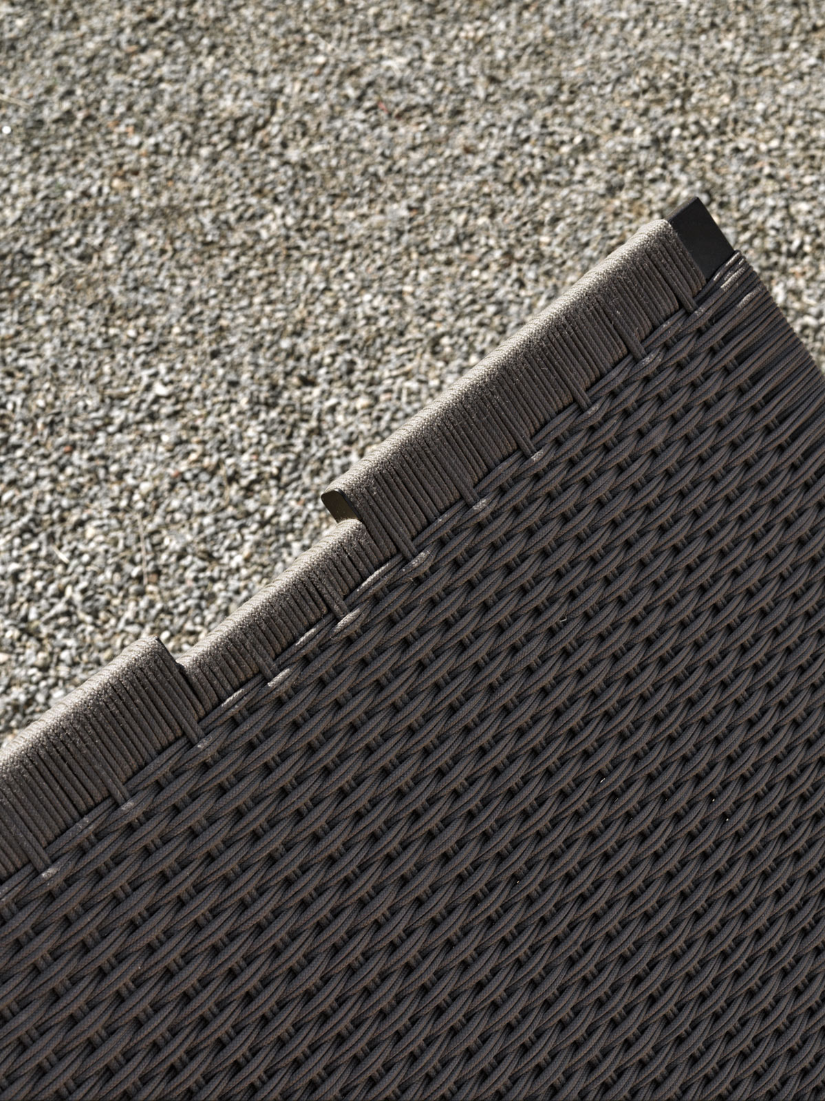 The sunbed, the archetype par excellence of outdoor furniture, interprets all the elements that characterise the aesthetics of the Timeout Collection, re-proposing the theme of the burnished painted aluminium band, running along the entire profile, and the traditional motif of the polypropylene rope weave.
