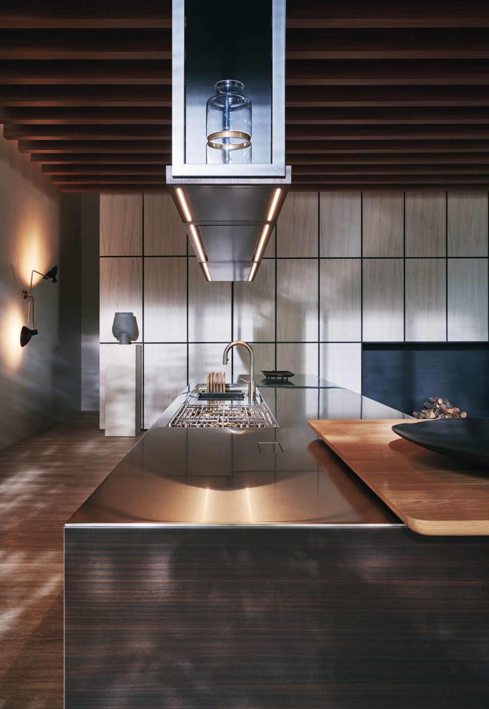 The composition is completed with the new system of shelves with built-in VVD hood and with the new Hi-Line6 snack bar, with its solid light oak and black oak top, featuring bevelled corners and profiles, on a titan and pewter aluminium frame. Precious materials such as eucalyptus for the island base units, with pewter aluminum framed doors, and steel for the top with integrated sink and hob.