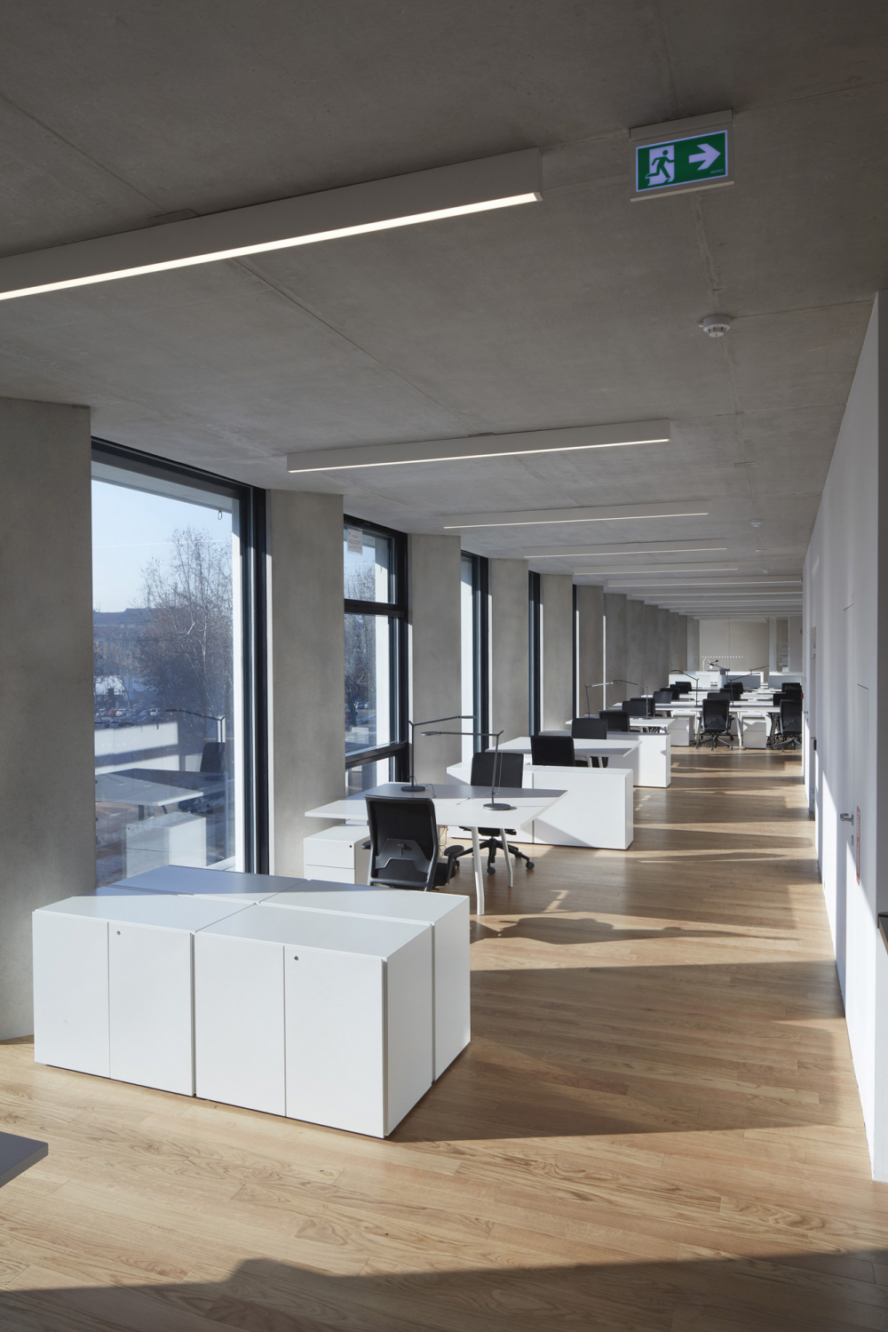 The two floors devoted to offices are defined by full-height partition walls adapted to the project specifications, with structure in natural-finish aluminum fixed at the ceiling and glazed paneling inserted in guides concealed in the raised flooring.