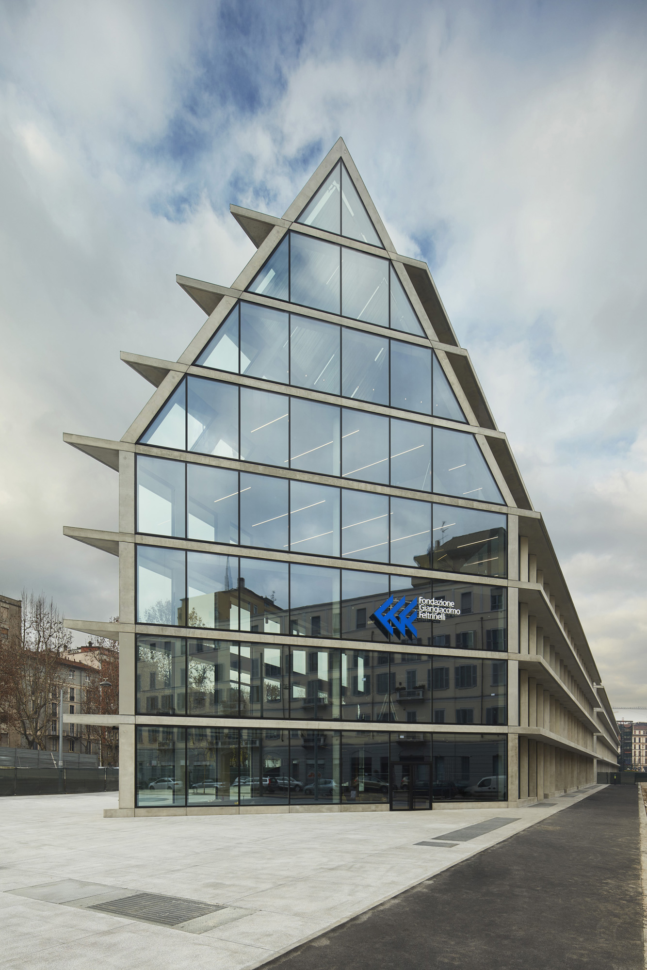 The project includes two twin buildings, headquarters of the Giangiacomo Feltrinelli Foundation and the offices of Microsoft Italia, and a large public green area with meeting points, bicycle paths and pedestrian walkways. The buildings were inspired by the simplicity and impressive scale of the structures that characterize Milan’s historic architectural landscape, including the Ospedale Maggiore, the Rotonda della Besana, the Lazzaretto, and the Sforzesco Castle.