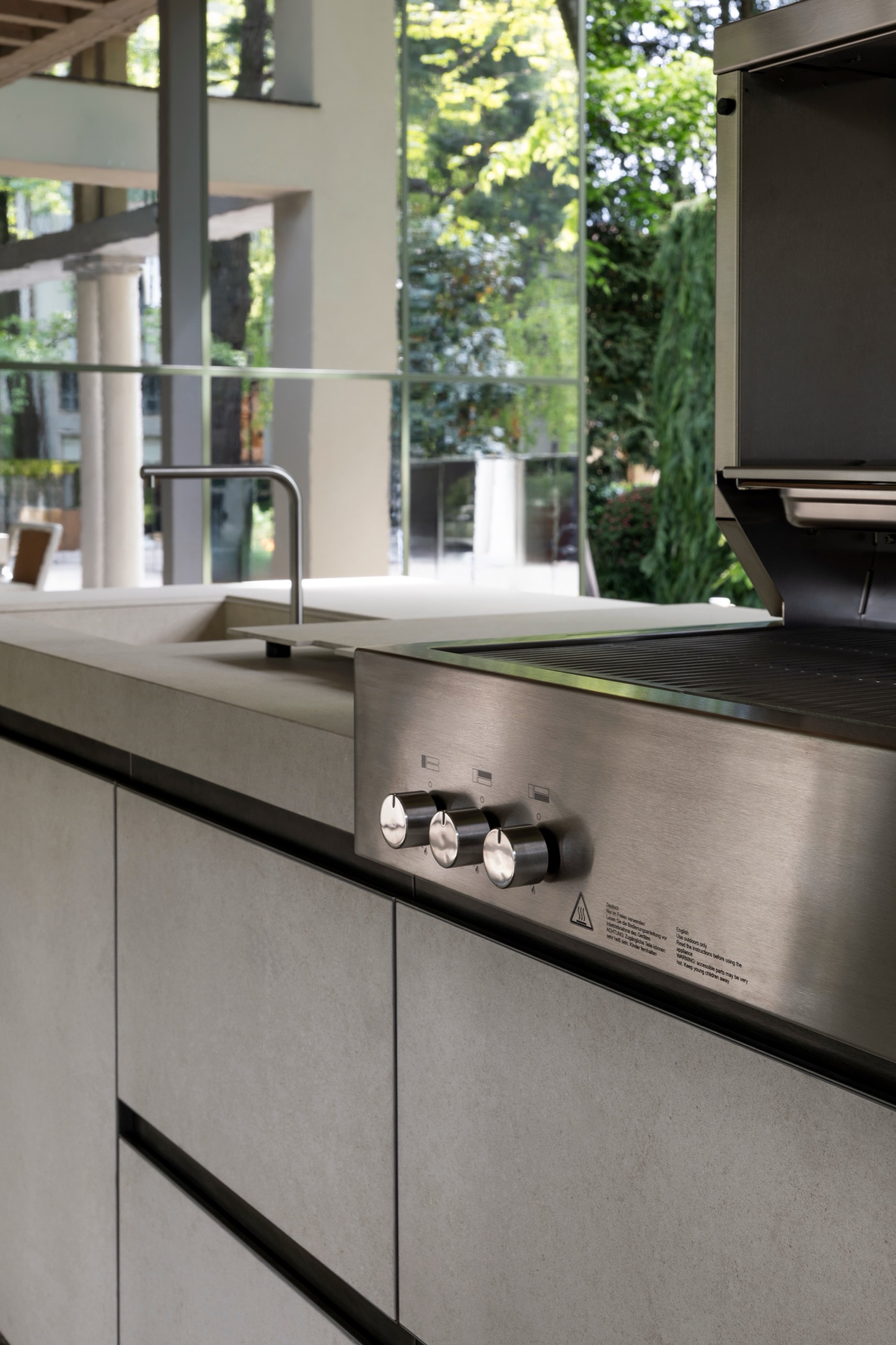 The Helios outdoor kitchen encapsulates Italian craftsmanship combined with innovative technology, making it suitable for outdoor use.