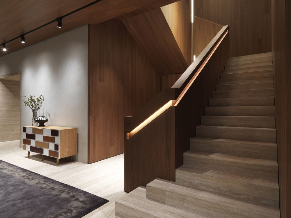 Each space provides a stunning backdrop for items instantly recognizable as Vincent Van Duysen’s signature designs. A particularly breath-taking entrance, built on an inner door open onto two floor-to-ceiling glass screens. A magnificent iconic staircase, the walnut cladding of which is in tune with the travertino marble steps. The same marble used for the portals. The floor-to-ceiling wooden entrance door to the Flagship Store – already part of the brand’s distinctive style – has been re-proposed in a version proportionate to the scale of the building.