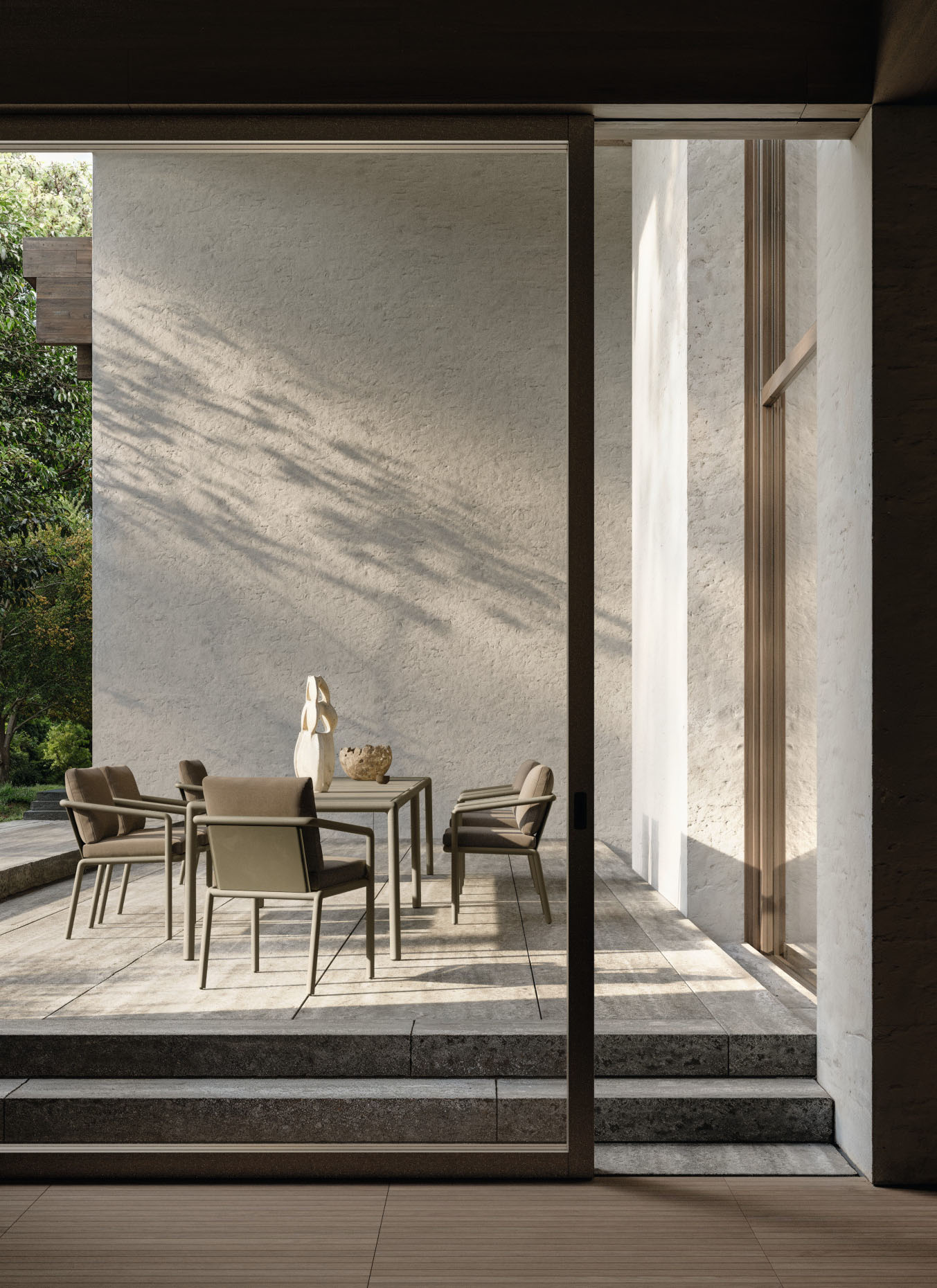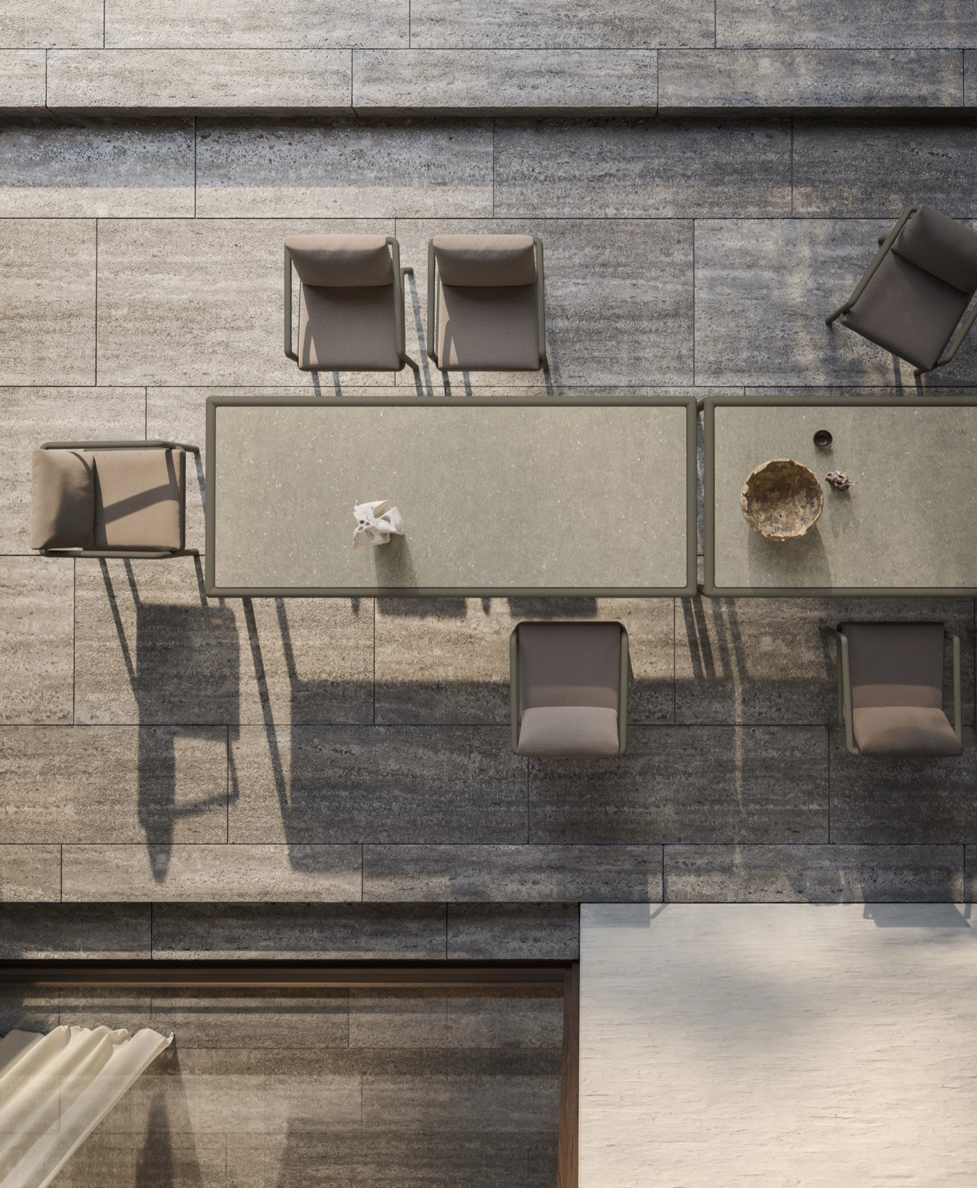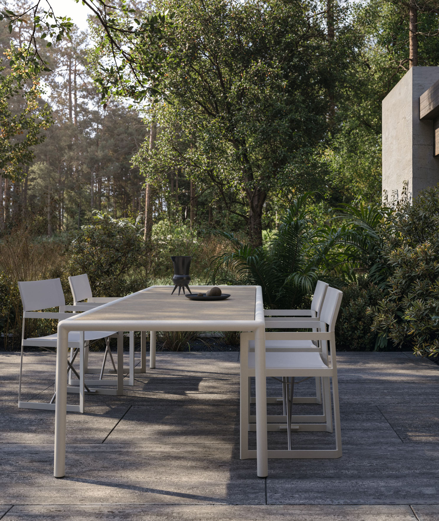 La table Soleva signée Vincent Van Duysen est idéale pour les moments de détente en plein air. Elle incarne un dialogue entre solidité et légèreté visuelle, l’ADN de la collection Soleva. Sa structure architecturale et longiligne en aluminium tubulaire thermolaqué compose une forme mesurée et structurée qui investit les espaces extérieurs. Ce design est entièrement empilable et ultra fonctionnel. Il est idéal aussi bien pour des terrasses résidentielles que dans des environnements d’accueil calmes.
