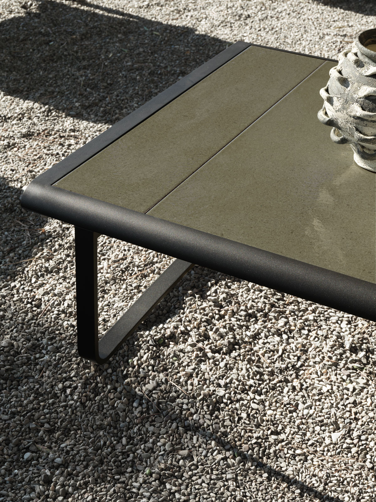 Completa la Collezione Timeout un ampio tavolo basso in due larghezze, per spazi esterni da vivere in modo versatile, intimo o conviviale. Riprende i motivi estetici della Collezione quali la fascia in alluminio color brunito, i profili e gli angoli stondati. Le basi di sostegno, ottenute dalla corsa continua della medesima fascia, sono in posizione arretrata rispetto al piano per renderlo visivamente più leggero, come sospeso.