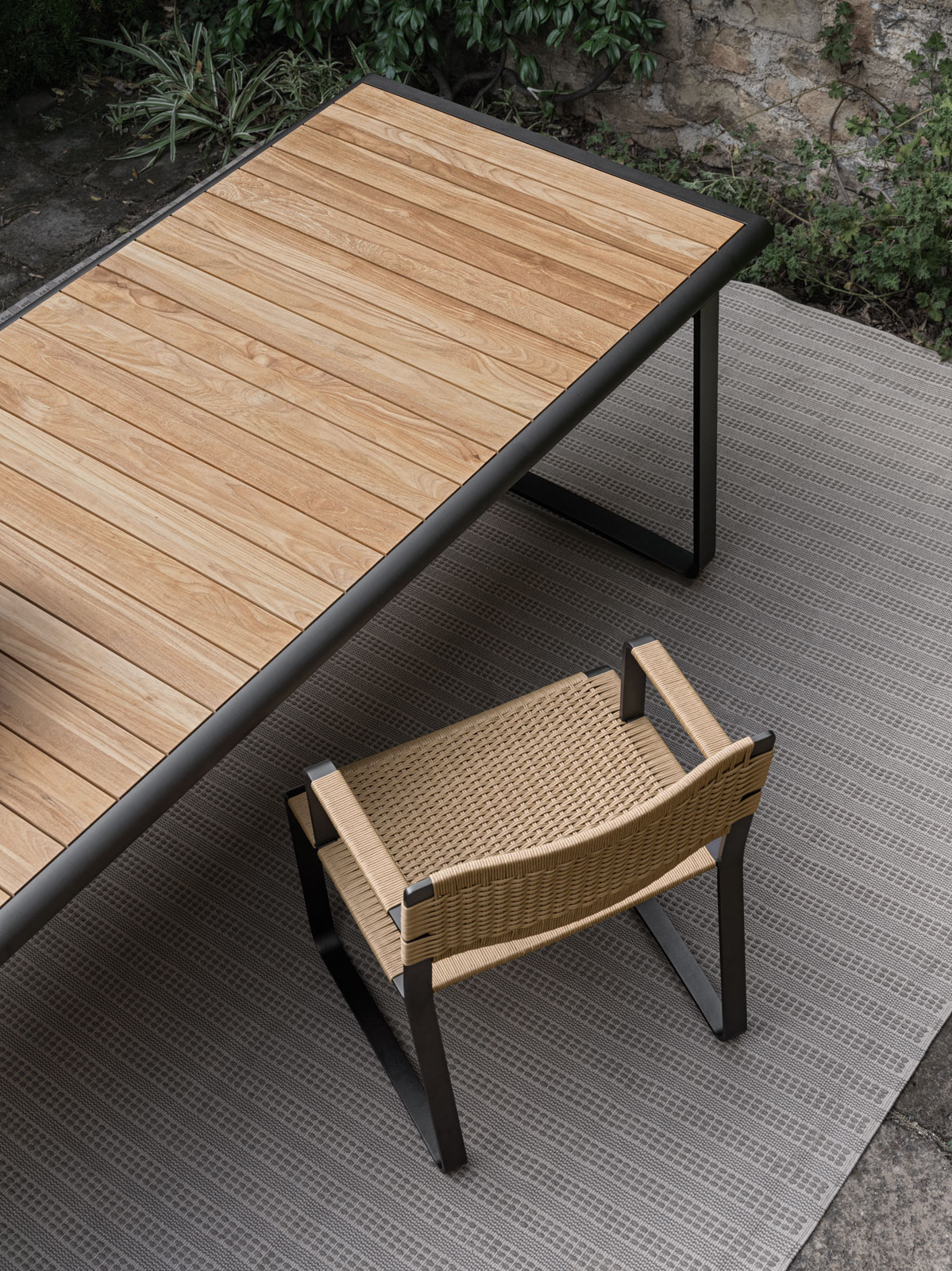 Il tavolo da pranzo della Collezione Timeout interpreta l'archetipo dei tavoli da esterno con il piano a doghe per far defluire l'acqua. Da 6 o 8 posti, si distingue per le proporzioni attentamente calibrate e per la scelta dei materiali che gli consentono di accordarsi con entrambe le nuove collezioni per outdoor di Molteni&C.