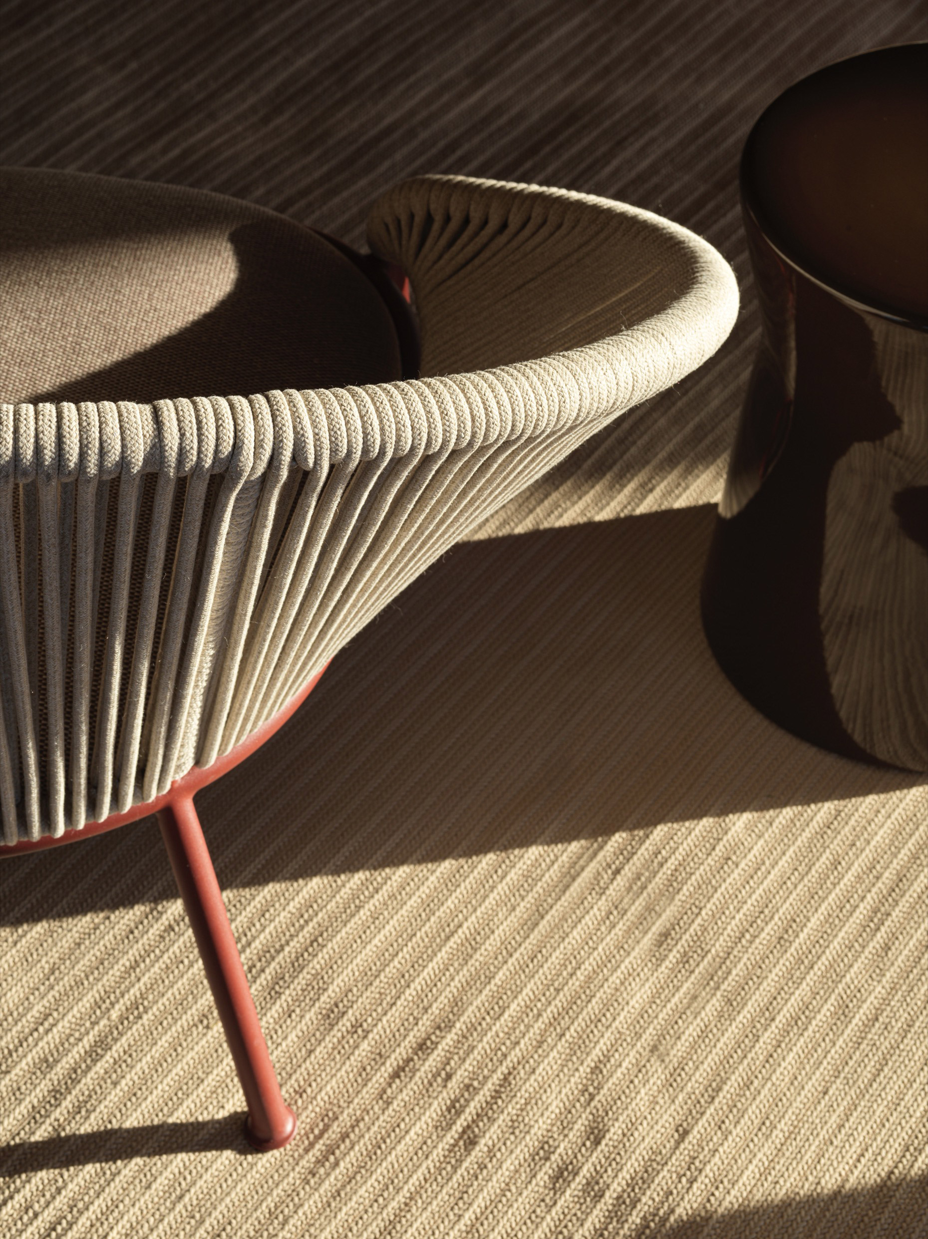 Una collezione dall'estetica minimale e contemporanea che interpreta elementi della tradizione mediterranea: il fer forgé e l'intreccio manuale in corda in polipropilene.