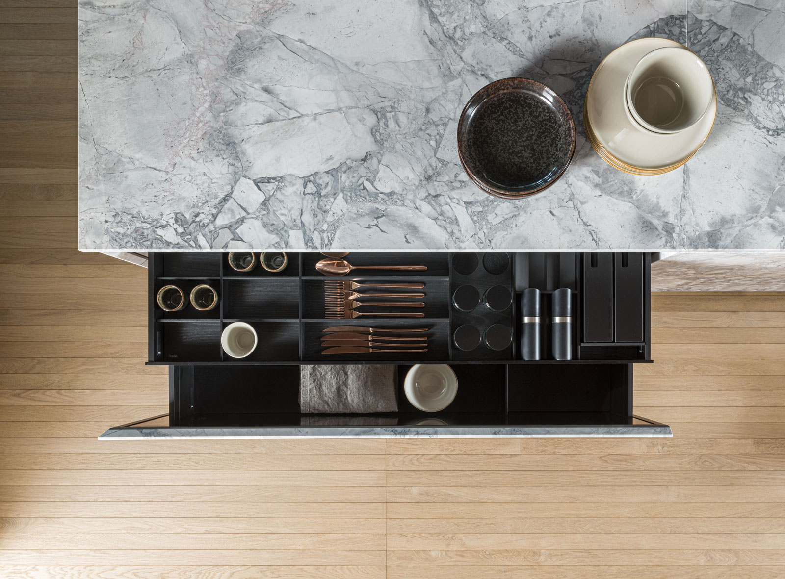Tutti gli elementi che compongono la serie sono realizzati con una base di MDF nero in pasta, impiallacciati con essenze di legno, mentre gli elementi divisori sono in legno massello oppure alluminio anodizzato o verniciato.