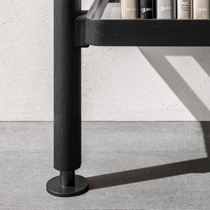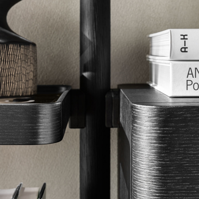 Ai montanti vengono agganciati originali ripiani “a vassoio” dai bordi arrotondati sugli angoli, in legno massiccio o in alluminio, il cui fondo può essere in vetro o legno.