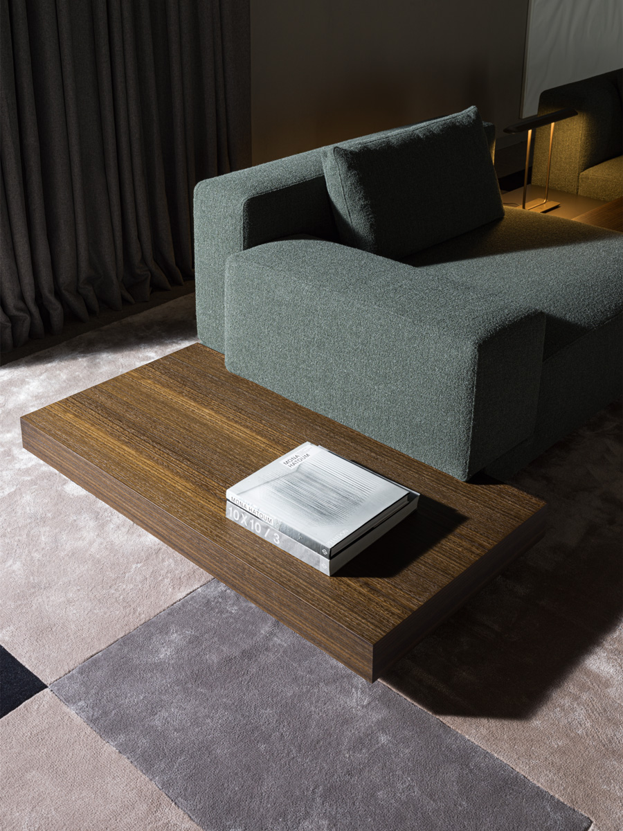 I tavolini trovano massima espressività insieme al sistema di sedute Marteen. Dinamiche soluzioni a domino presentano così una stratificazione di volumi uno sopra l’altro e creano piccoli spazi privati, che si aprono con semplici gesti per riporvi oggetti personali.