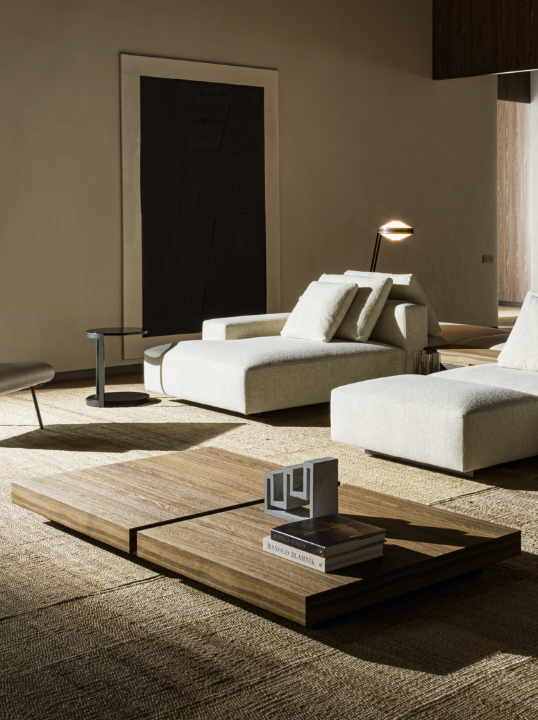 “Quasi fosse una derivazione diretta del divano Marteen, i tavolini integrati e d’appoggio presentano una caratteristica unica: volumi mobili e mutevoli. Gli elementi della costruzione – che ricordano le creazioni di Gabriella Crespi – sono ancor meglio valorizzati grazie alla possibilità di combinarli a diverse altezze e con forme differenti.”