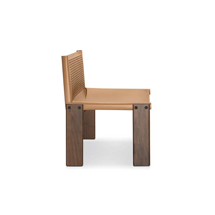 Una reinterpretazione esclusiva della poltrona Monk, realizzata in collaborazione con Cabana, aggiunge un tocco distintivo al design modernista. La struttura in noce americano sostiene uno schienale in cuoio naturale caratterizzato da un motivo traforato al laser, disegnato da Cabana e ispirato all’intreccio viennese.