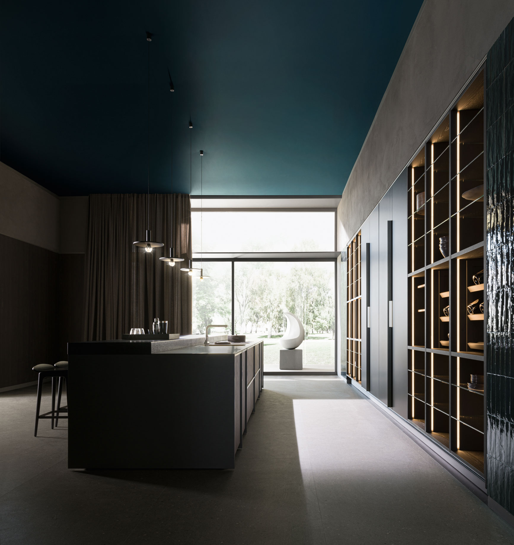 Ratio viene concepita come una cucina componibile, dove la struttura è protagonista: reticoli metallici disegnano l’architettura di basi, pensili, colonne, cappe e accessori. Volumi pieni, volumi vuoti e piani di diversi spessori si agganciano agli elementi tecnici strutturali, esili e minimali, creando un elegante gioco di equilibri.