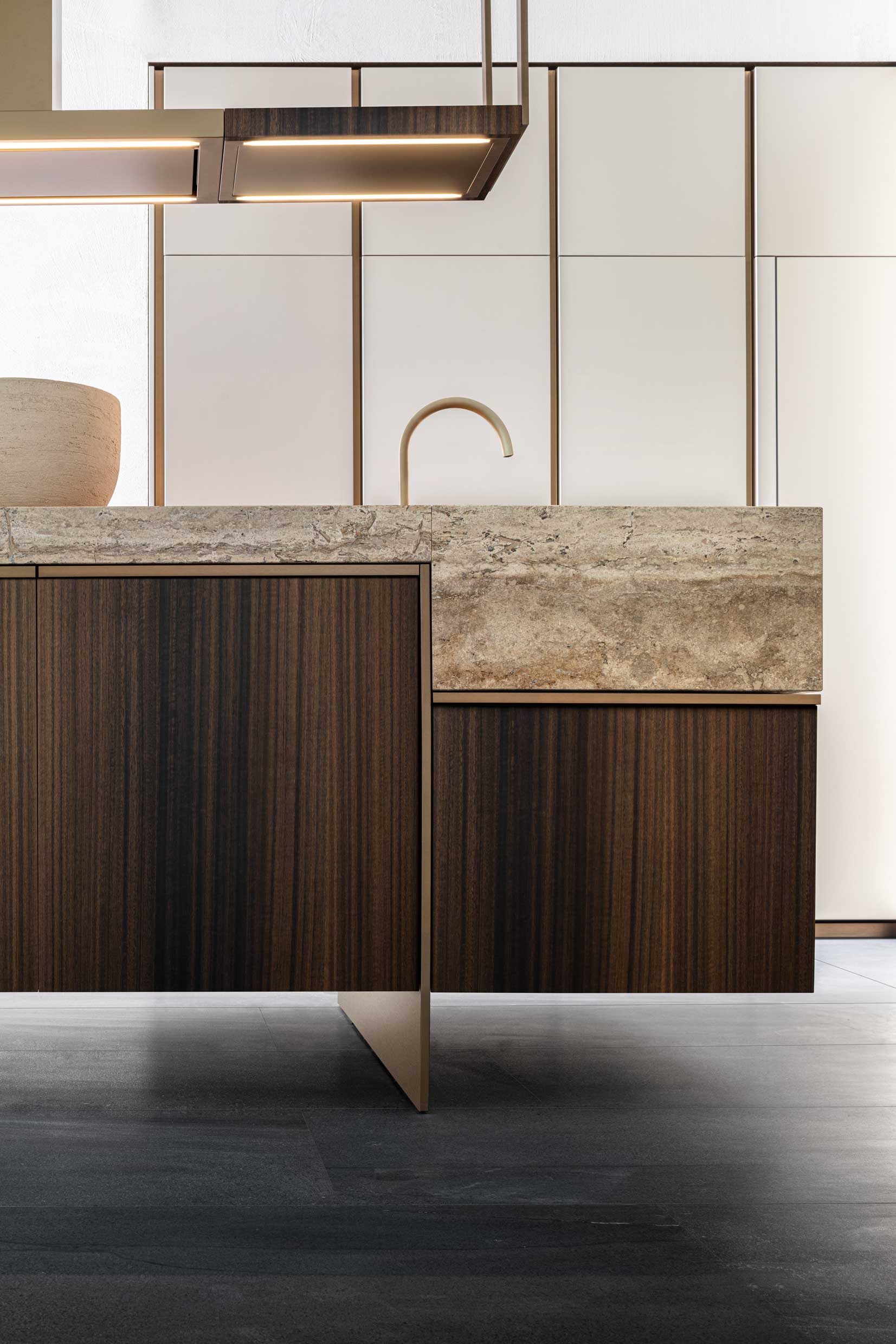 La ricerca sui materiali è sempre orientata al calore e ai caratteri mediterranei, con alternanza tra essenze raffinate come il rovere thermo, e pietre naturali sofisticate come la nuova Breccia Capraia.