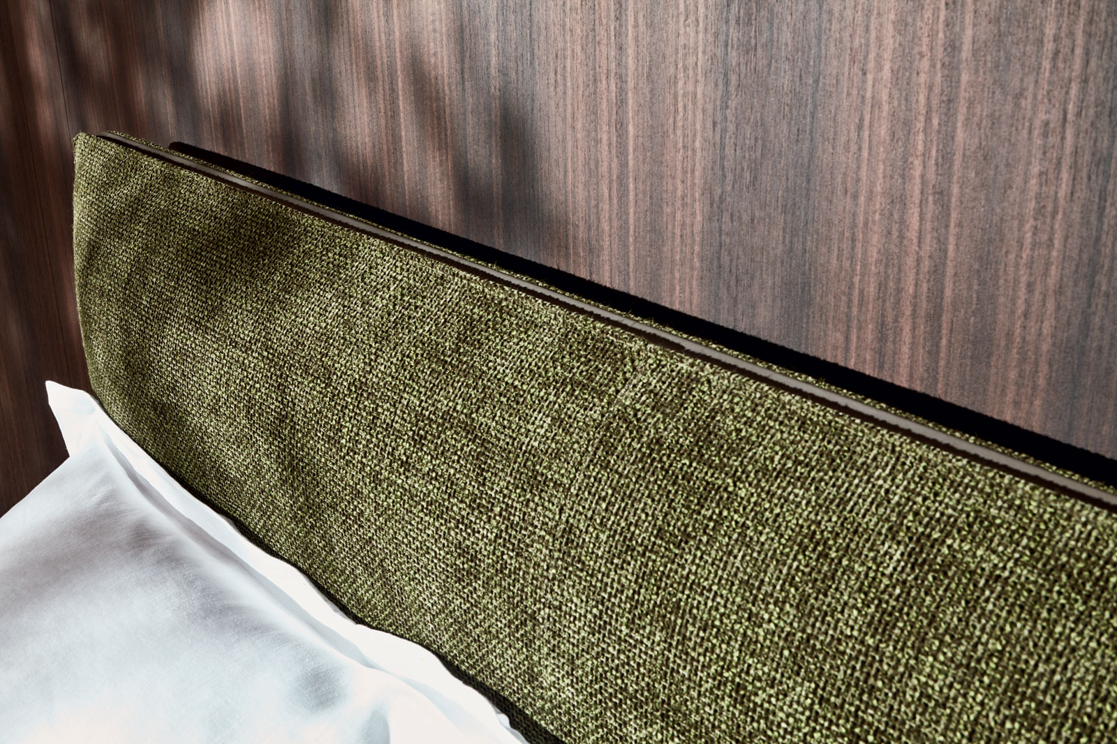 Ribbon, progettato da Vincent Van Duysen, segna l’ingresso del designer fiammingo in Molteni&C. Il rivestimento, tessile o di pelle, si aggancia a un nastro, con dettagli in pelle, che corre lungo tutto il perimetro della testata e del giroletto, con funzioni sia strutturali che estetiche. Come in una coccarda la silhouette soffice e accogliente rimarca la familiarità dell’oggetto.