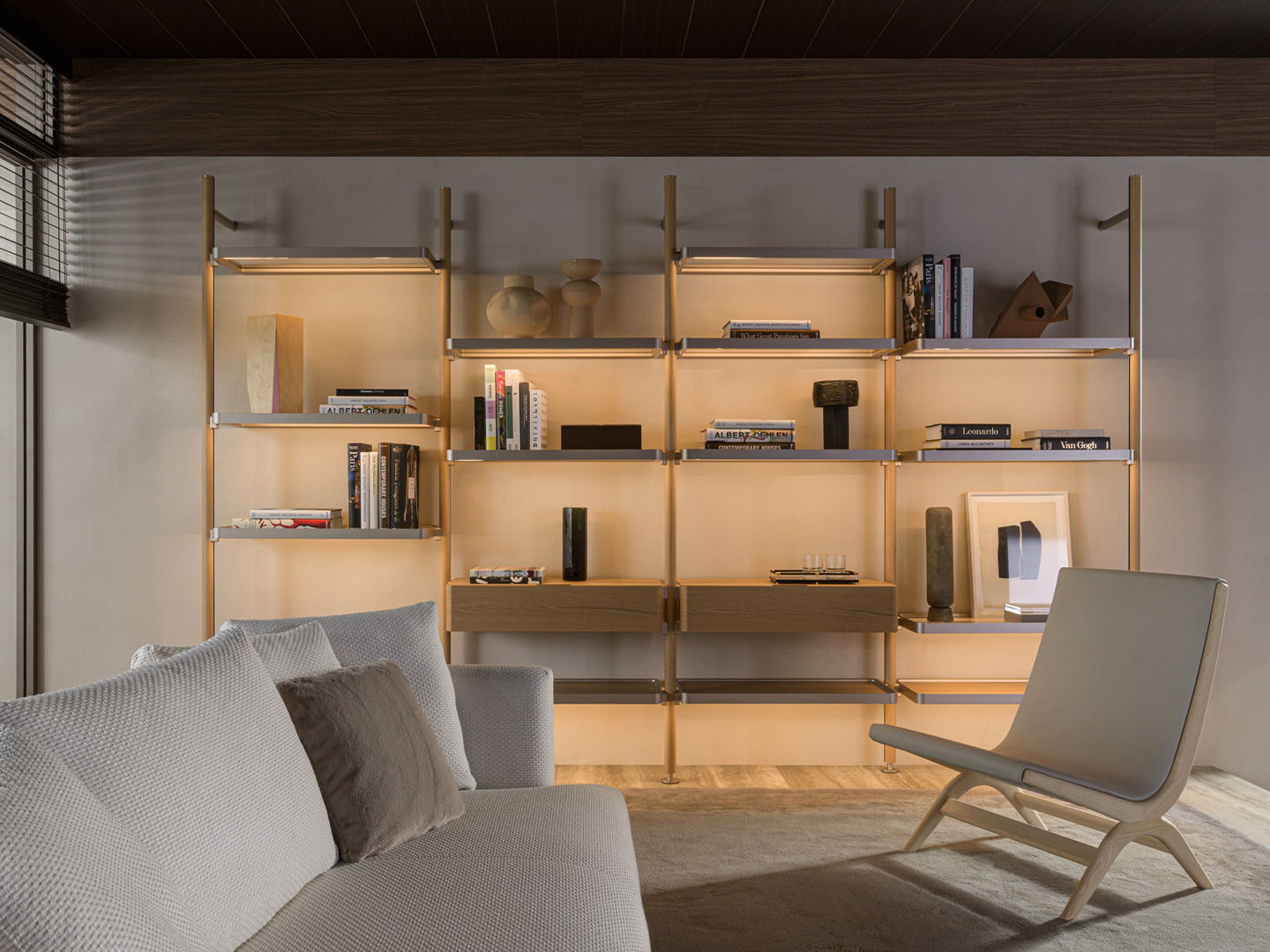 With his Hector project, Vincent Van Duysen makes his debut in the world of upright modular bookcases. 2022 sees the introduction of versatile, aesthetic and functional features, which widen Hector’s compositional offering. Hector is a versatile and innovative day and nighttime system. Hinged containers with cushioned top opening, in addition to drawers in the low module, enrich the compositions, giving access to additional storage solutions, which make the bookcase more functional.