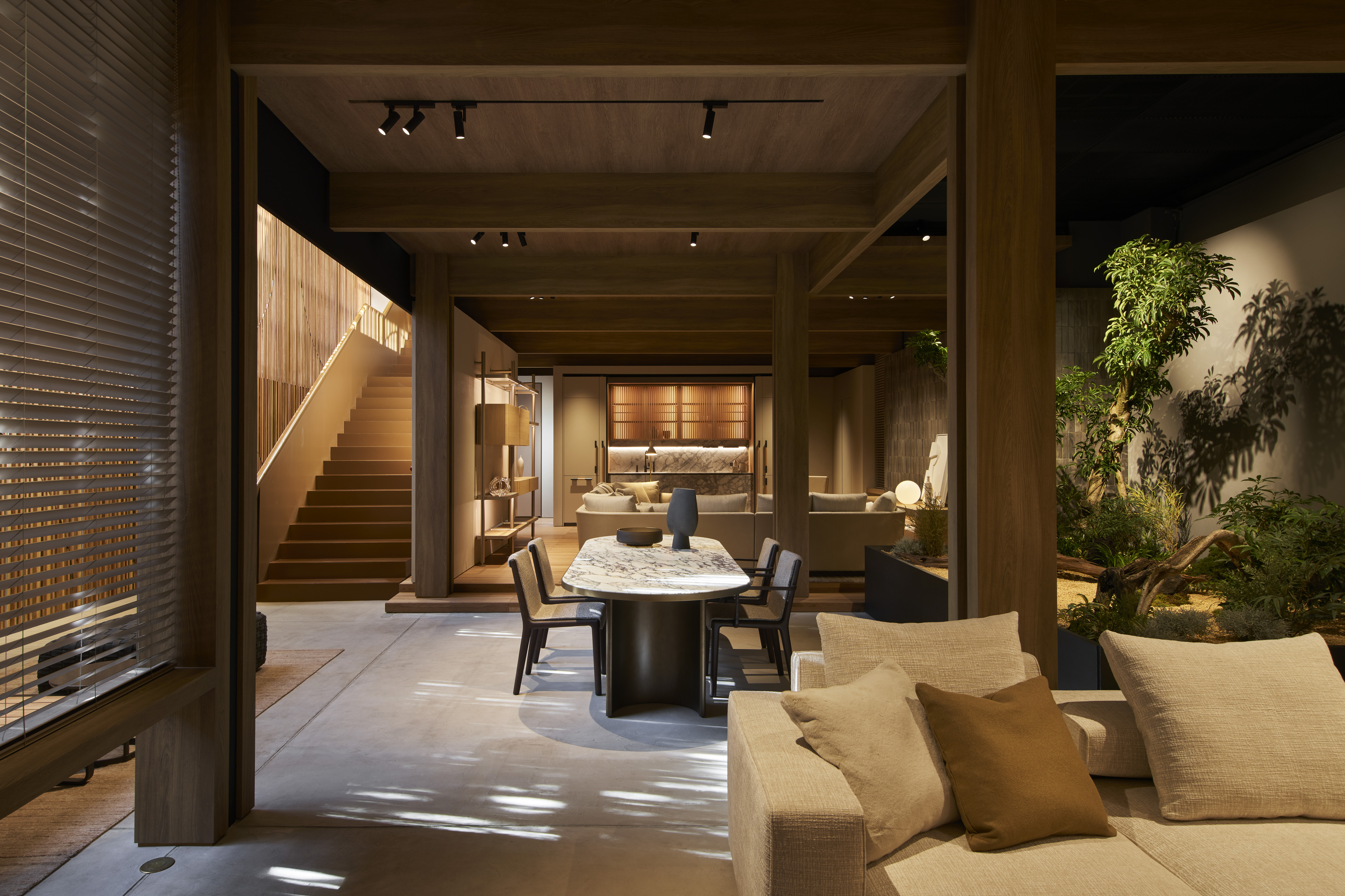 ショールーム地下1階は、2022年のミラノサローネでクリエイティブディレクターのヴィンセント・ヴァン・ドゥイセンが描いた建築の世界観を再現。