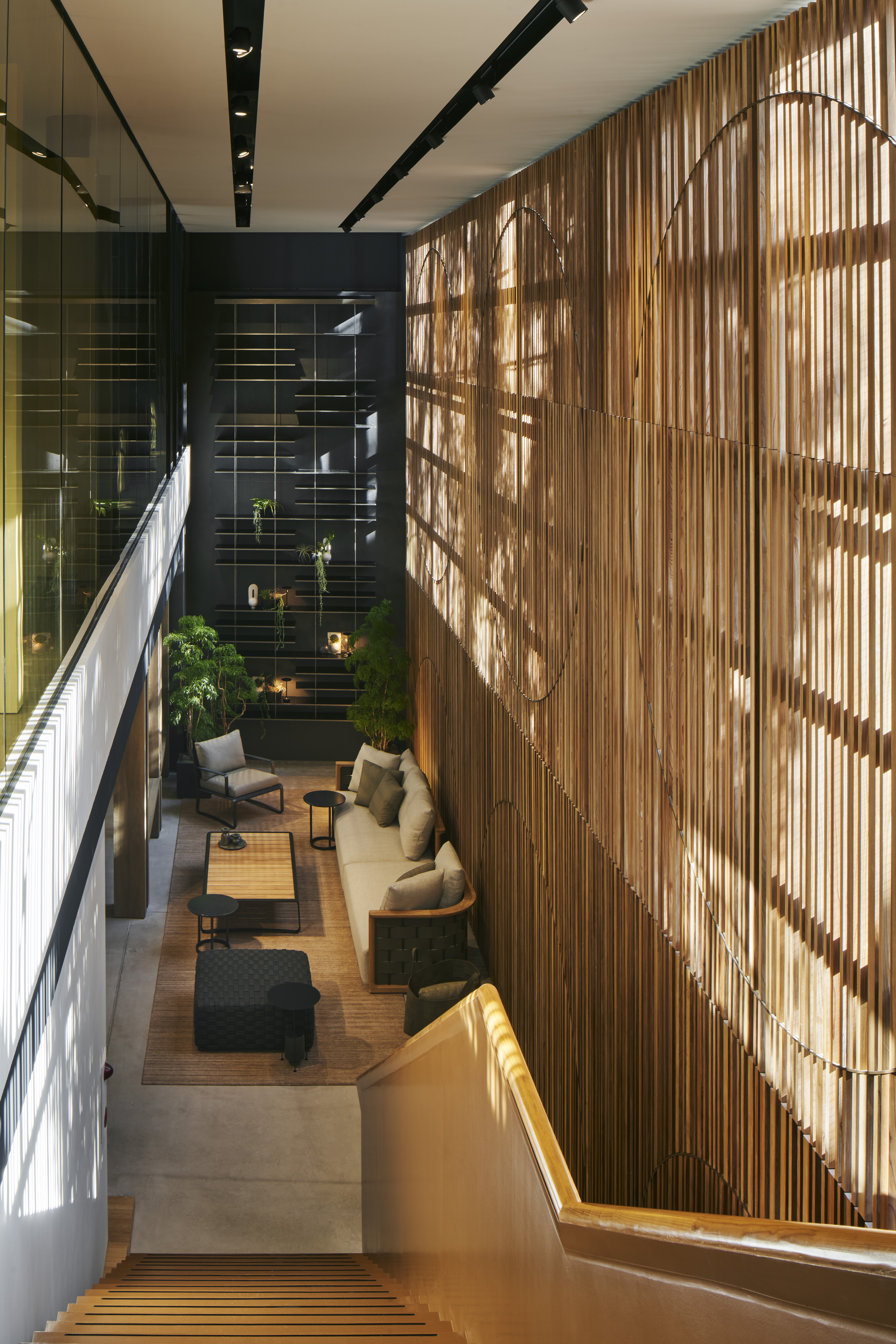 東京・南青山の旗艦店〈モルテーニ・ダーダ東京〉では、最新コレクションの国内発表発売に合わせて増床リニューアルを行いました。新たにオープンしたナイトショールームは、眠るだけではない情感豊かなベッドルームのしつらえと多彩なワードローブ収納をご覧いただけるエリアです。また従来のショールーム地下1階もムードを一新しアウトドア家具の展示をスタート。さらにオフィス機能を備えたラウンジも新設し、合計5つのエリアにわたってブランドの魅力を余すところなくご体感いただける施設へと生まれ変わりました。