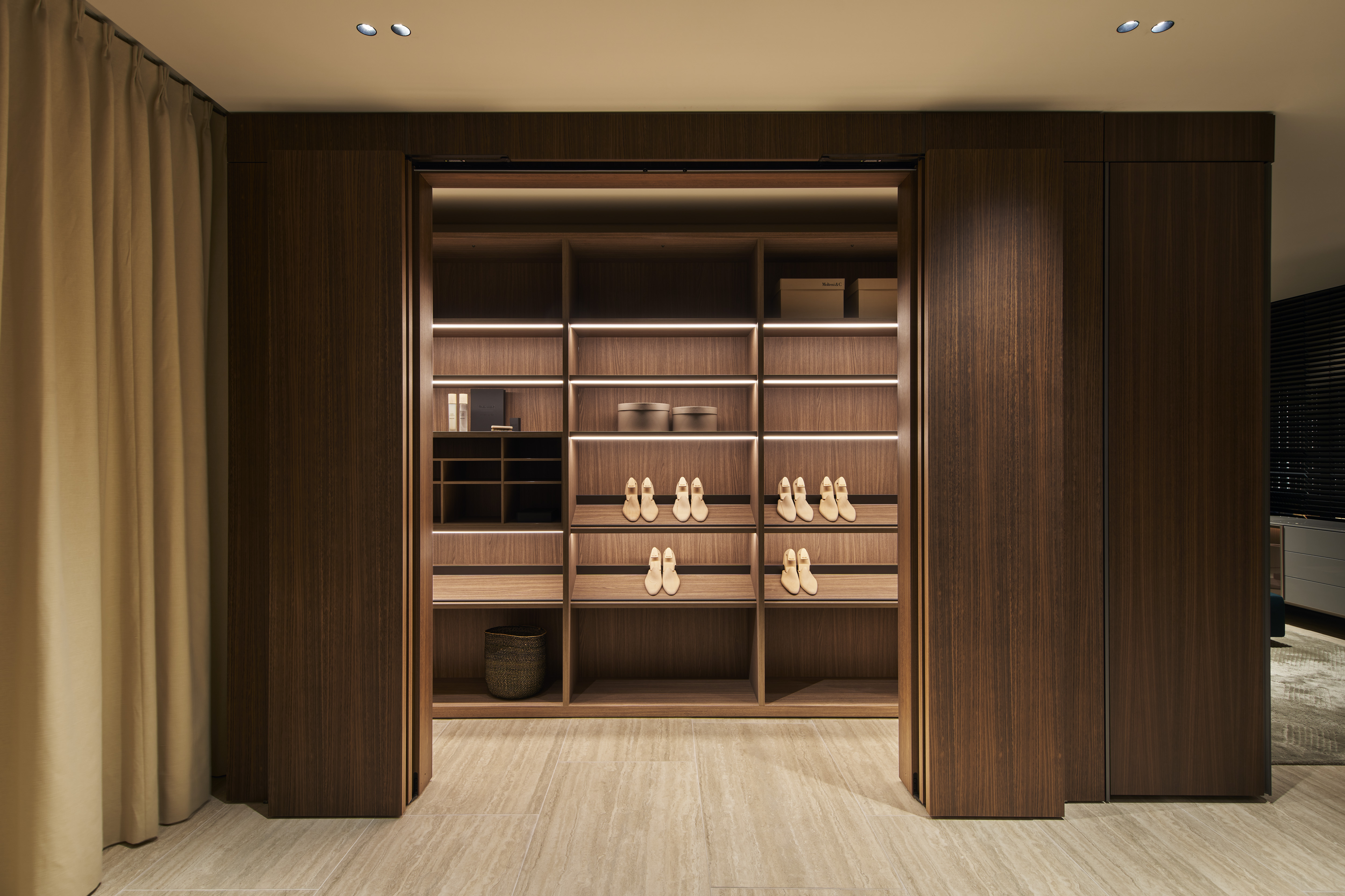 モルテーニ代表製品である「GLISS MASTER」と「MASTER DRESSING」で構成した機能的なワードローブ収納。