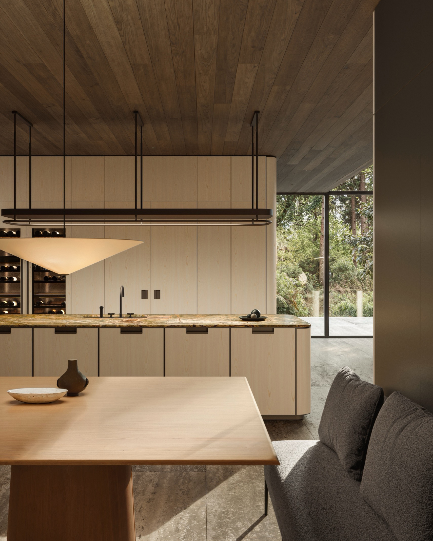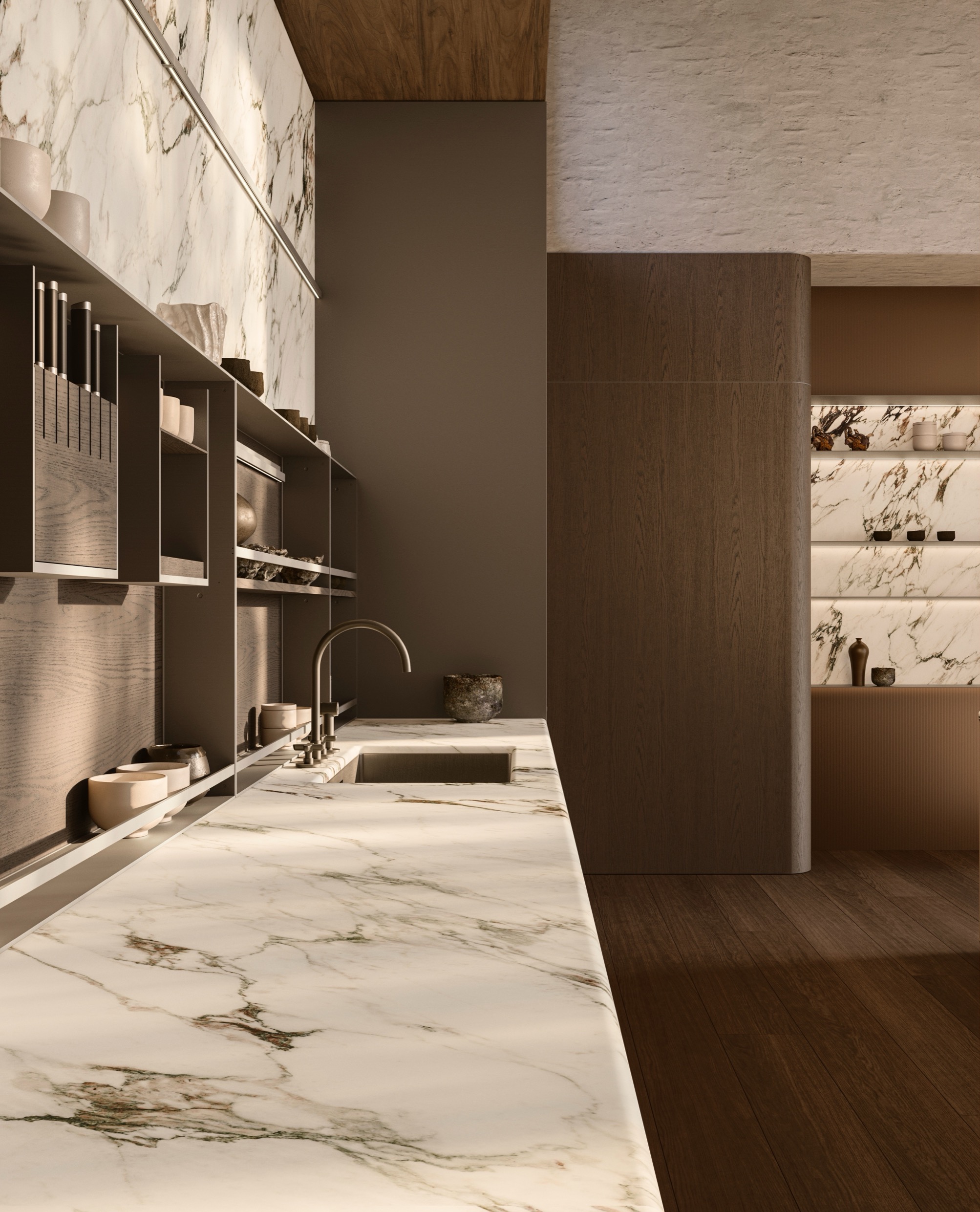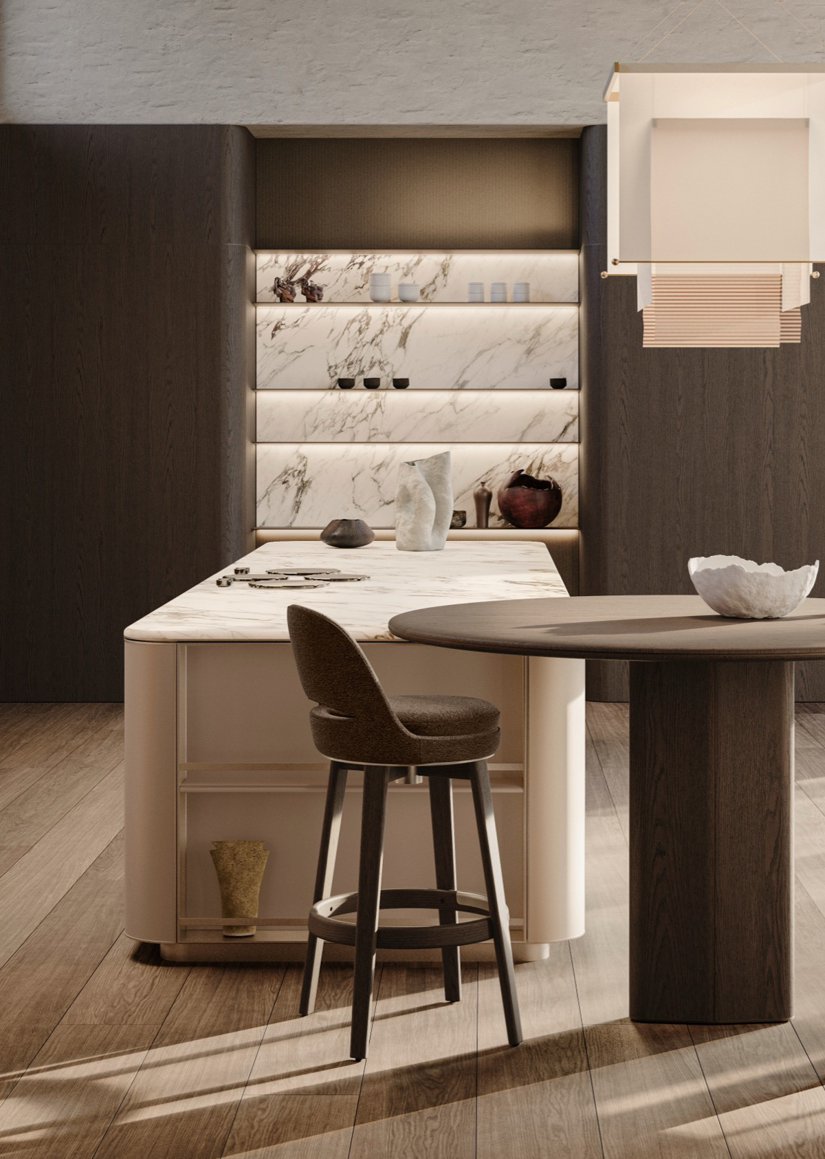 ワークトップの厚みは、その曲線に沿ってあしらわれた控えめなメタルインサートによって強調され、素材の連続性と視覚的な柔らかさを際立たせています。オープンコンパートメントやガラス扉は透明感と軽やかさをもたらし、重厚さと開放性の対話を生み出すことで、空間の流動性を高めています。