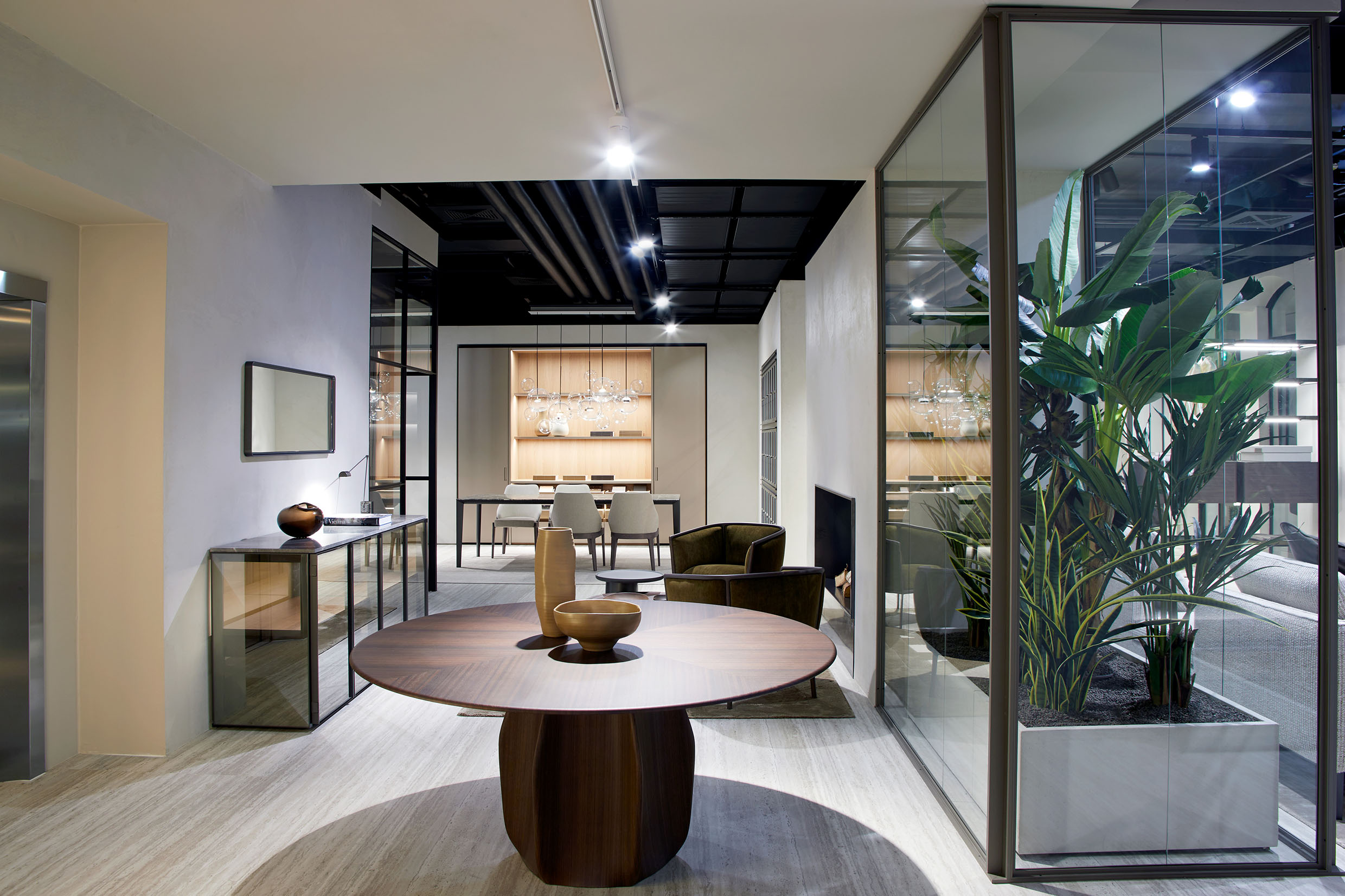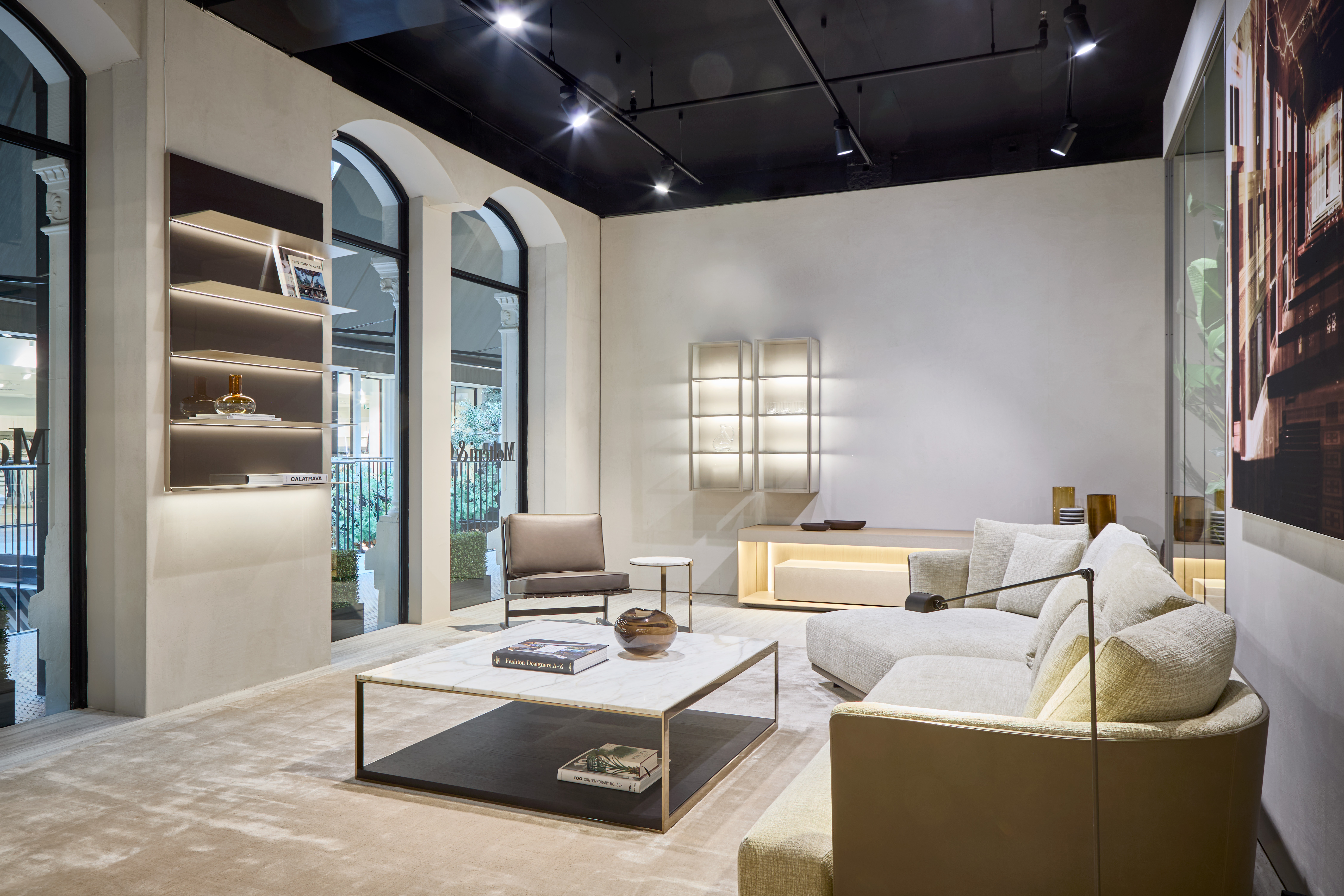 The main entrance invites guests to immerse themselves in a journey of discovery of the best-sellers and most iconic pieces of the Molteni&C collections, designed by some of the most prominent architects and designers on the Italian and international scene. Patricia Urquiola’s Asterias table, the star of the first small atrium, flanks a lounge area in which two Margou armchairs and the Louisa coffee table, both designed by Molteni&C creative director Vincent Van Duysen, combine with the fireplace to create an intimate atmosphere.