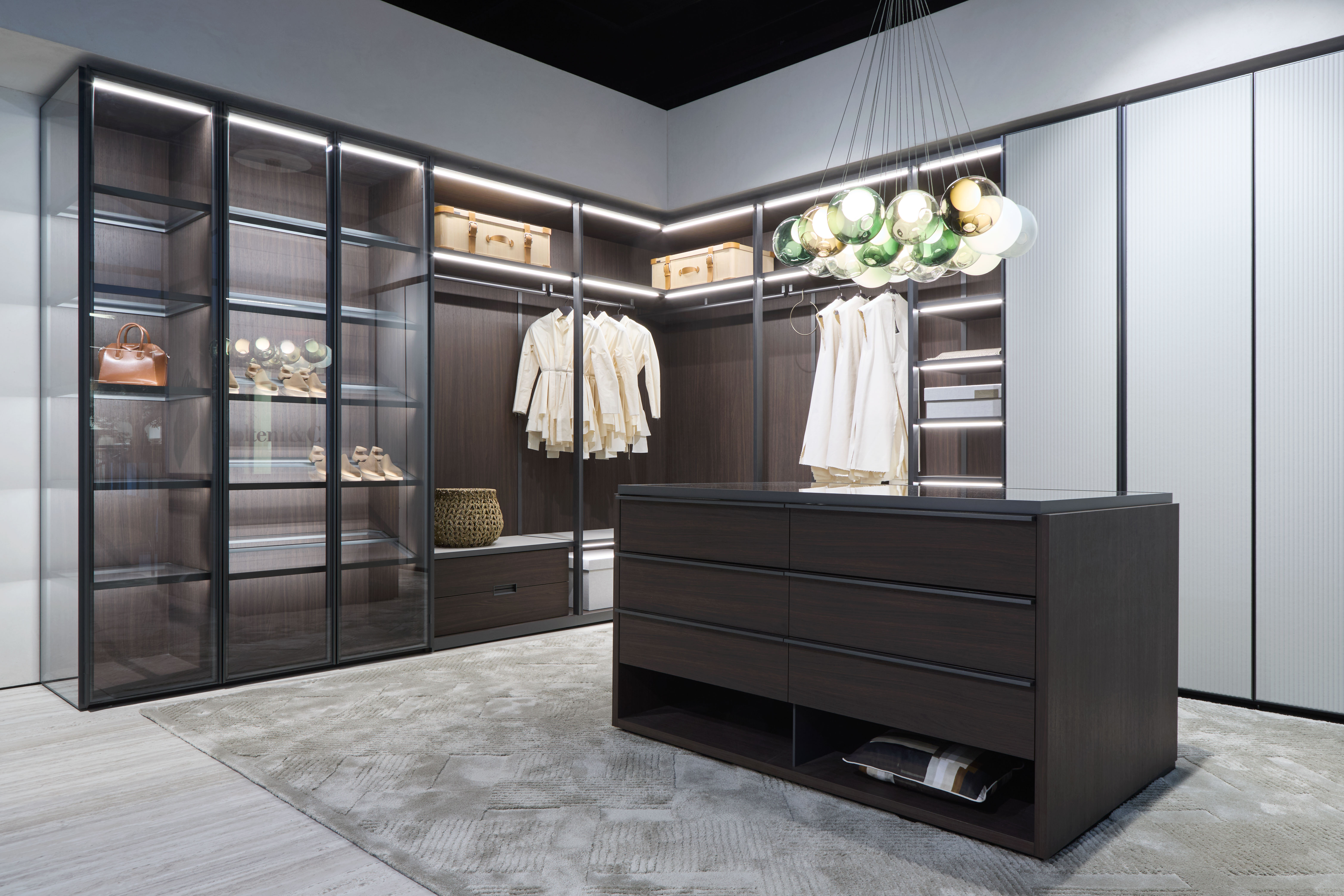 A small green area gives a glimpse into a first living space proposal, where the Cleo sofa plays the starring role. An exemplar of the Paula armchair and Vincent Van Duysen’s Logos system complete the furnishings. The Hector bookcase, in its Night version, is the perfect solution for introducing a walk-in closet concept, where the Vibrazioni rug is framed by the Gliss Master, the flagship of the Molteni&C night collections.