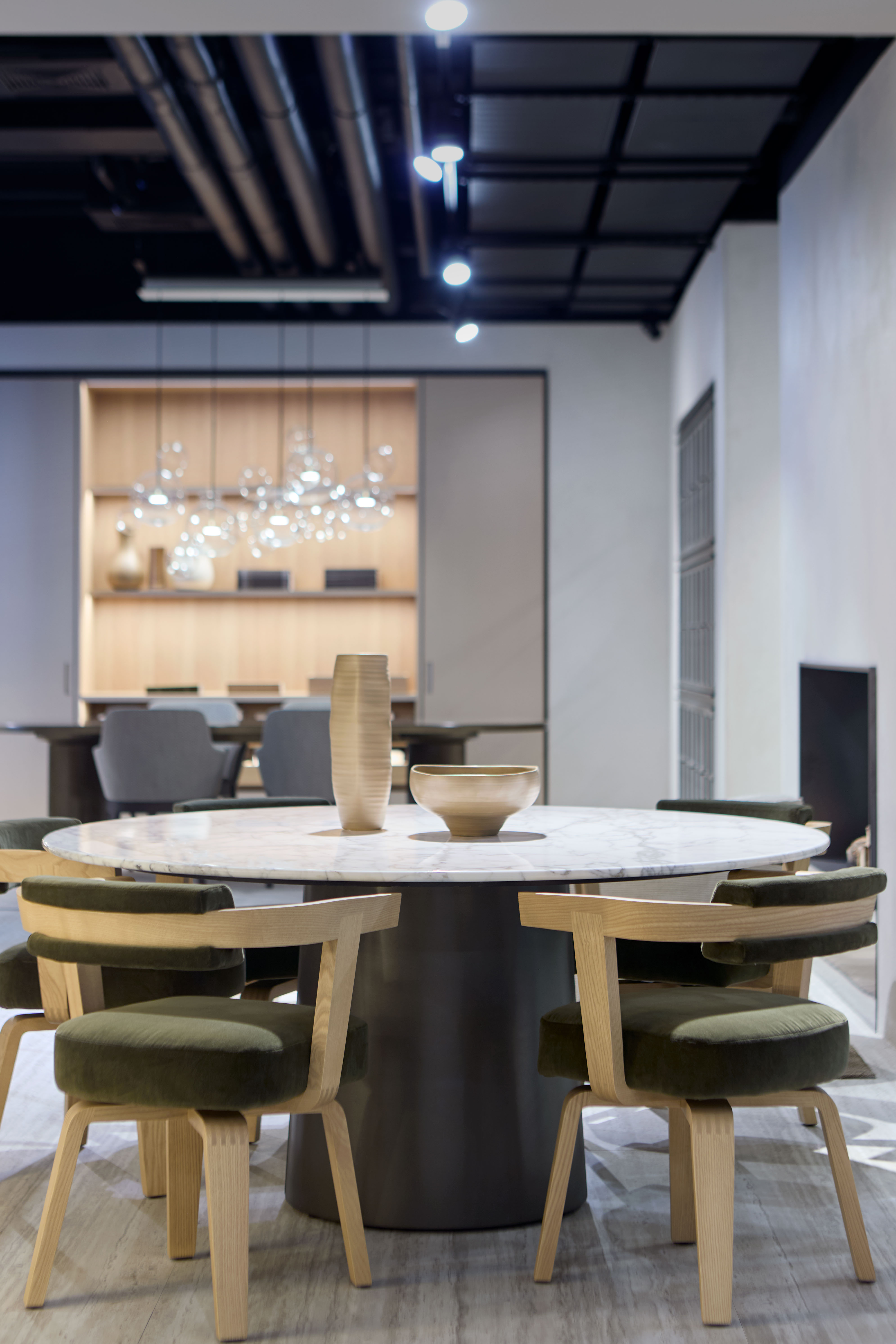 Moving on in the space, the majestic and iconic Piroscafo, placed alongside a material library dedicated to design, is the backdrop for the Filigree table by Dordoni, accompanied by Chelsea seatings.