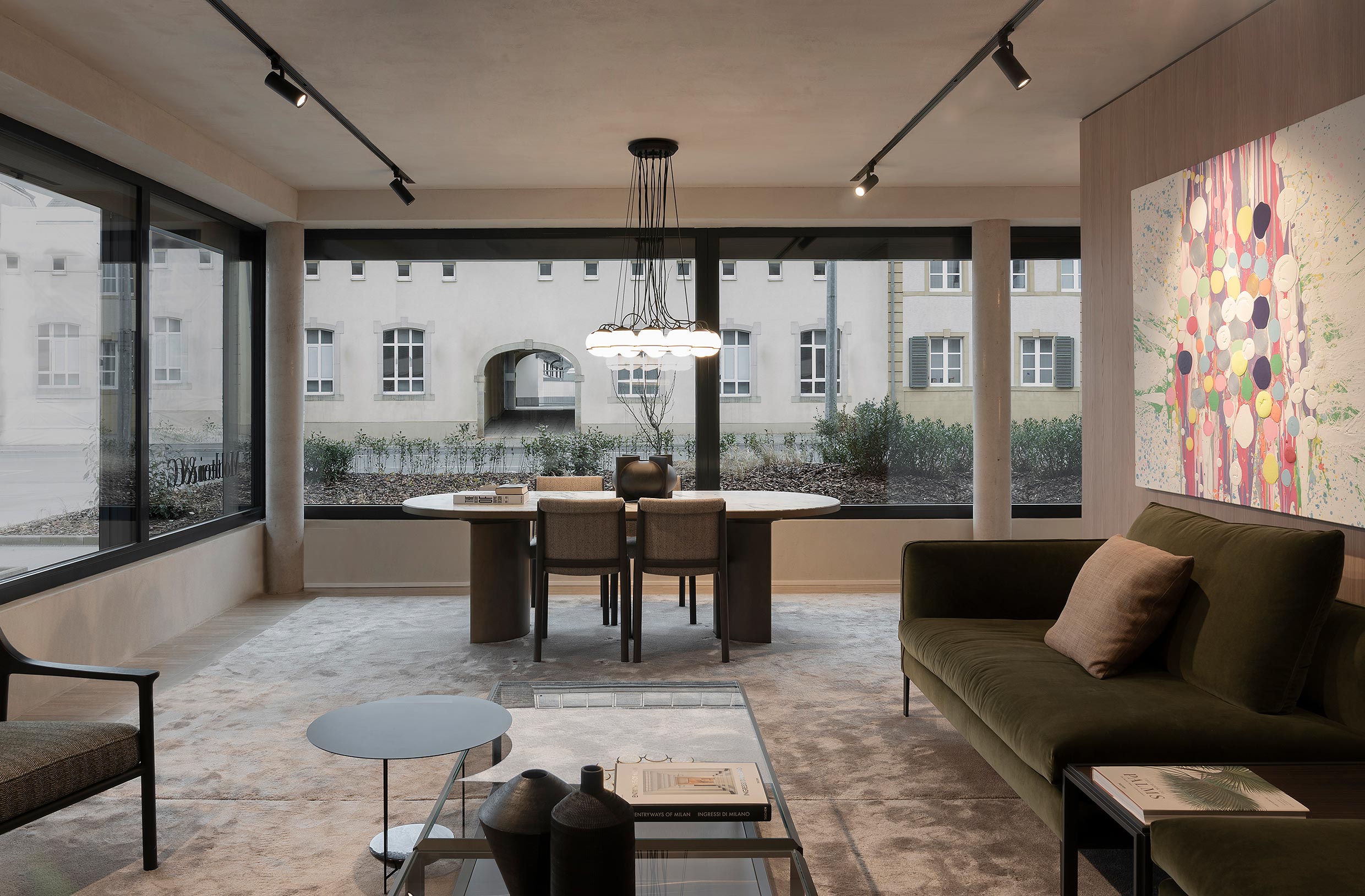 A living area greets guests immediately inside the entrance, setting the tone for the store's refined aesthetic. The iconic Round D.154.5 armchairs by Gio Ponti from the Heritage Collection and the Regent coffee table by Vincent Van Duysen create a serene sitting area, followed by Van Duysen’s VVD Kitchen, complete with the Devon chairs by Rodolfo Dordoni, for the store’s first kitchen display.