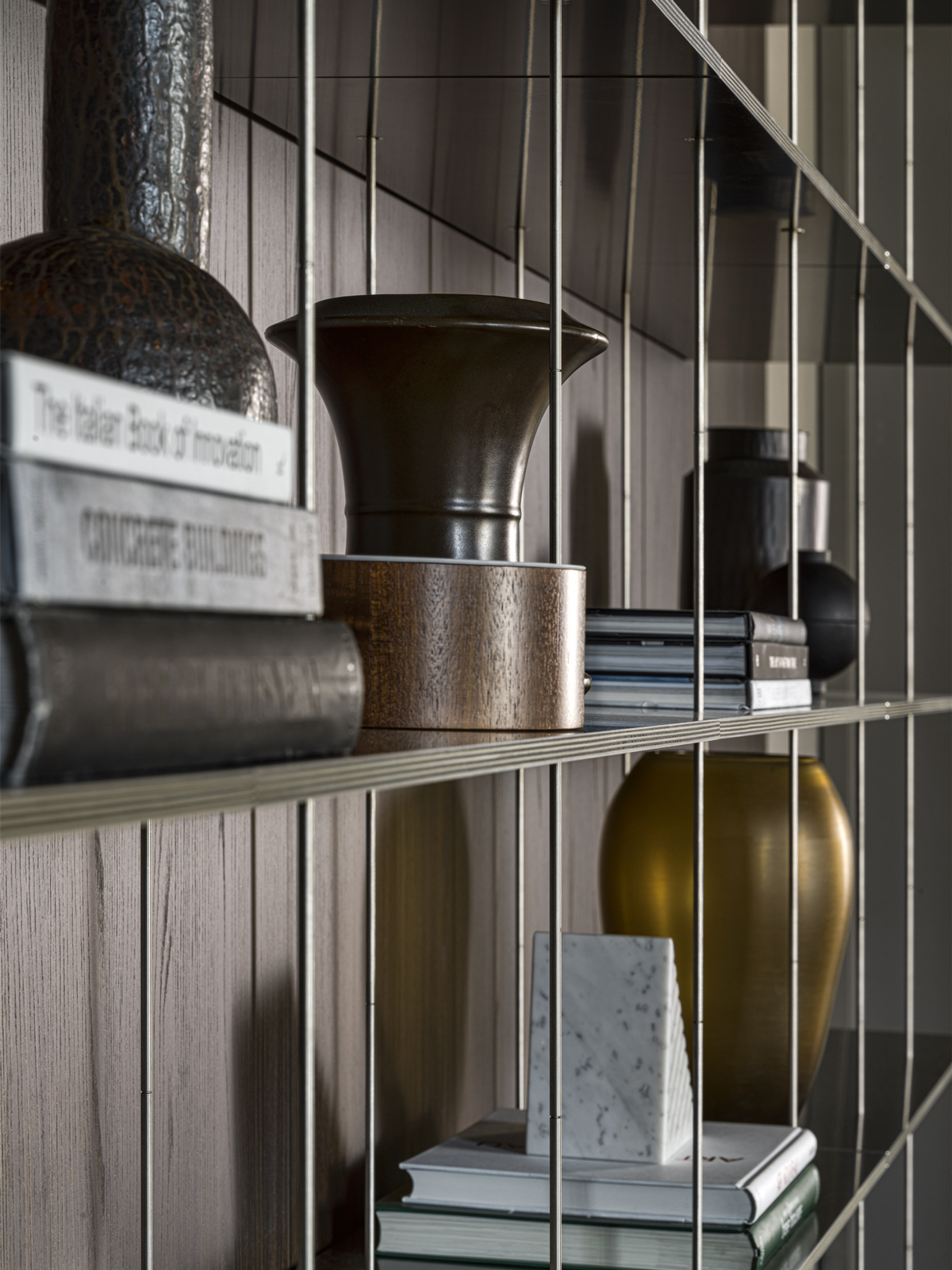 The extremely thin steel tie rods are equipped with notches to which the shelves can be fixed according to needs and create an interesting alternation between solids and voids, making the shelf itself appear as if it were floating suspended in the air.
