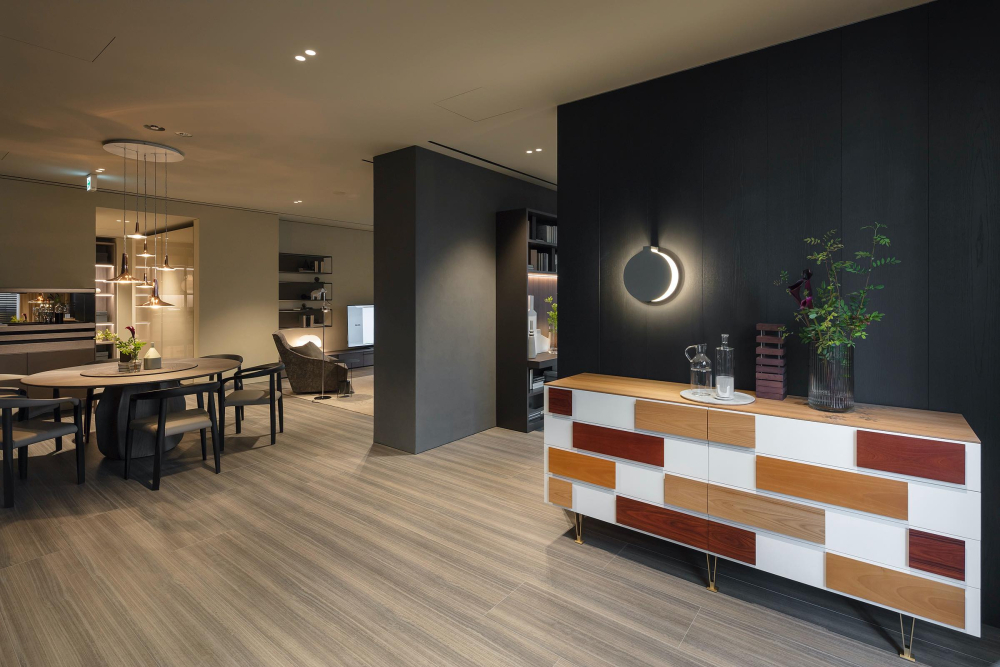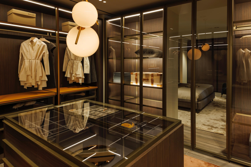 リビング、ダイニング、ベッドルームの他、モルテーニの代名詞とも言えるワードローブシステムで構成されたウォークインクローゼットや、機能美溢れるキッチンも2つのエリアでご覧いただけます。