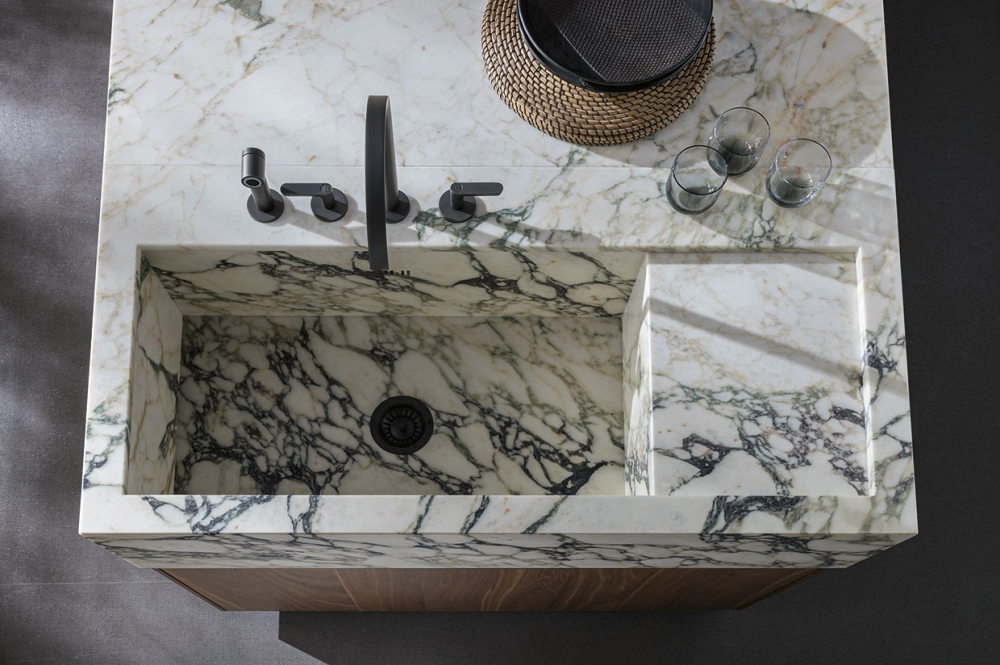 As regards colors, however, the kitchen winks at warmer shades and a Mediterranean style, alternating precious essences such as Mooreiche oak and black palm with refined natural stones, from Breccia Capraia to silk georgette marble, with metals such as bronze aluminum intersperses everything.