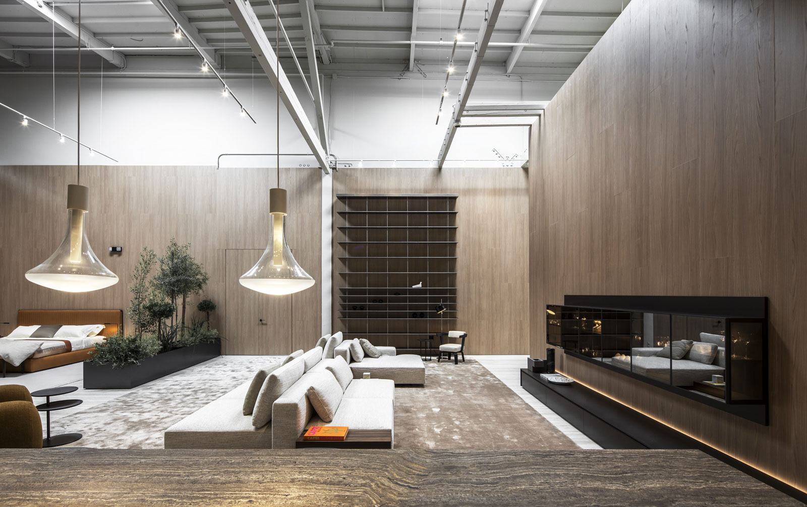 A central living area features the Marteen sofa, Cinnamon armchair by Naoto Fukasawa, and the iconic D.552.2 small table by Gio Ponti. The Gliss Master walk-in wardrobe system, Ovidio bed, and other pieces by Van Duysen complete the store’s bedroom collection, creating a serene and functional sleeping area.