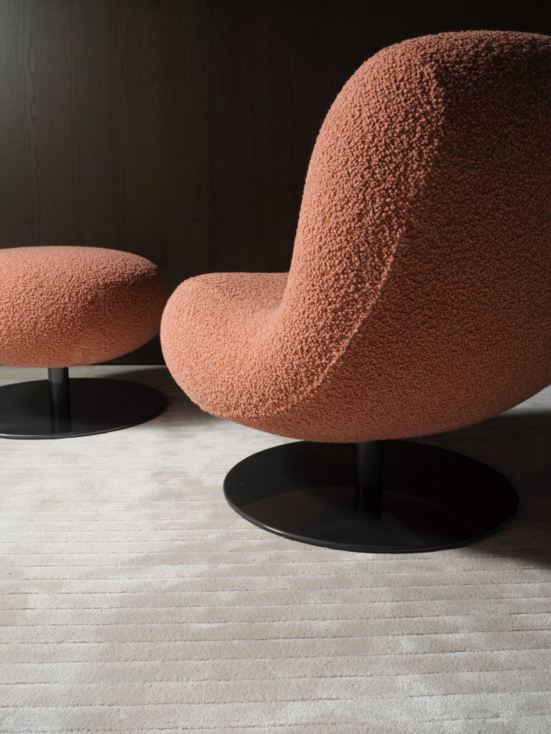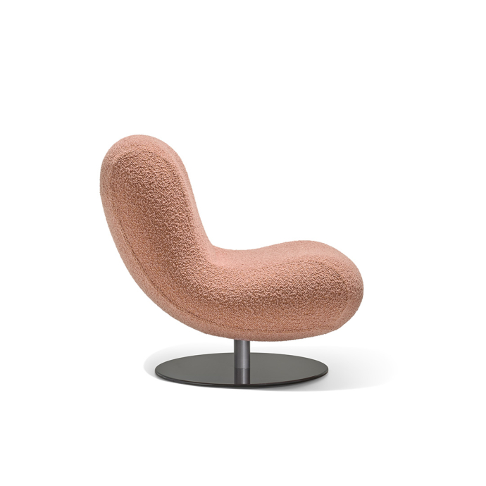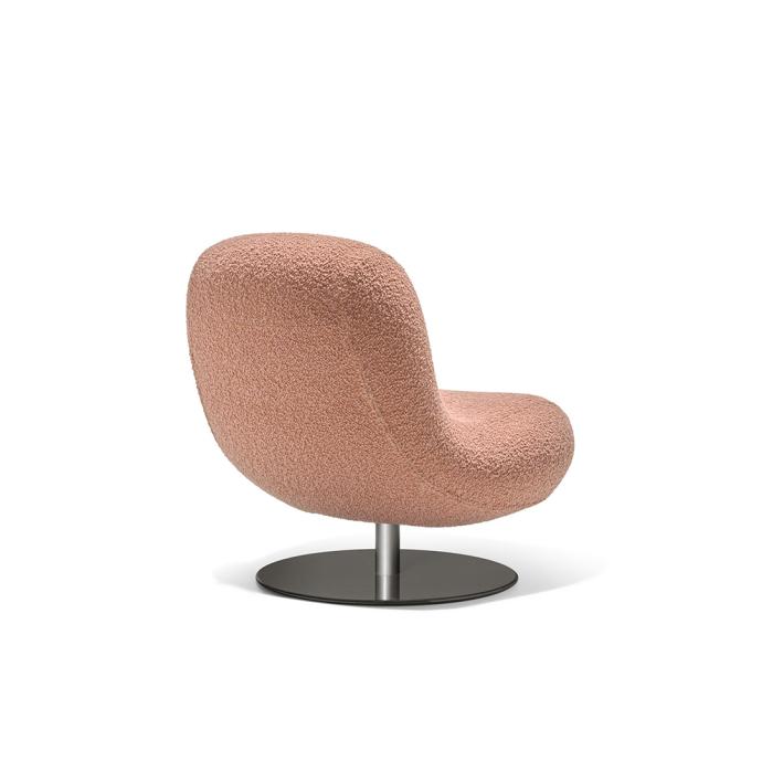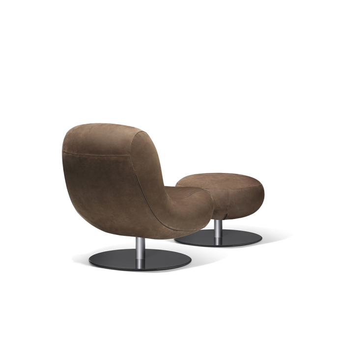 A swiveling metal base, reduced to a round disc with a central supporting column, anchors the volume while allowing freedom of movement. When paired with the matching footstool, Bosco extends its function into an even more relaxed posture.