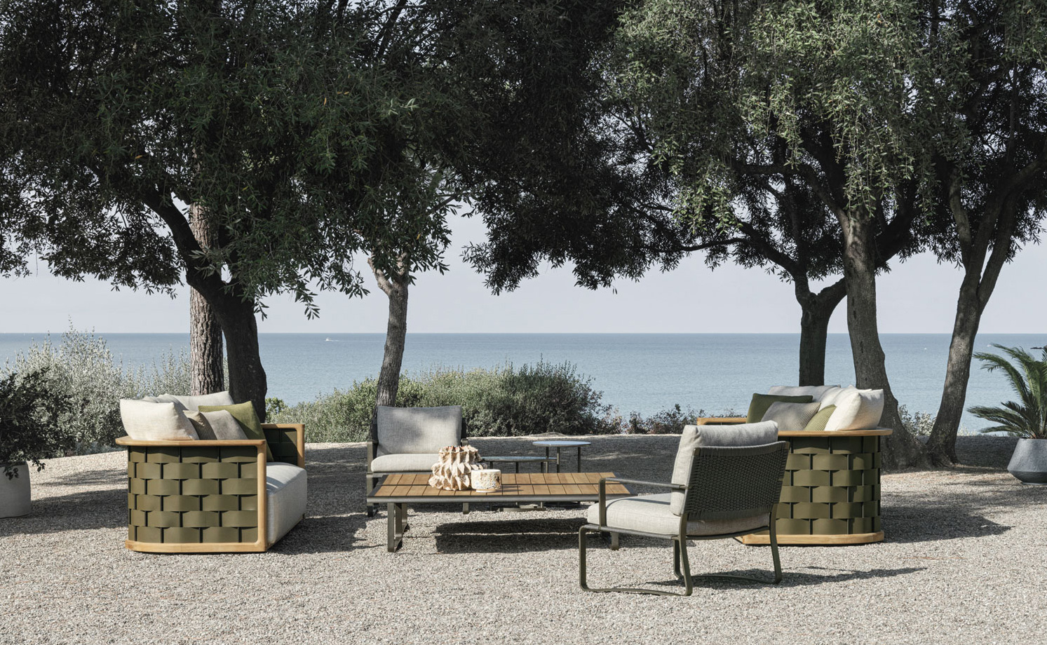 Completing the Timeout Collection is a large low table in two widths, for versatile, intimate or convivial outdoor living spaces. It picks up on the aesthetic motifs of the collection such as the burnished aluminium band, profiles and rounded corners. The support bases, obtained from the continuous run of the same band, are set back from the top to make it visually lighter, as if suspended.