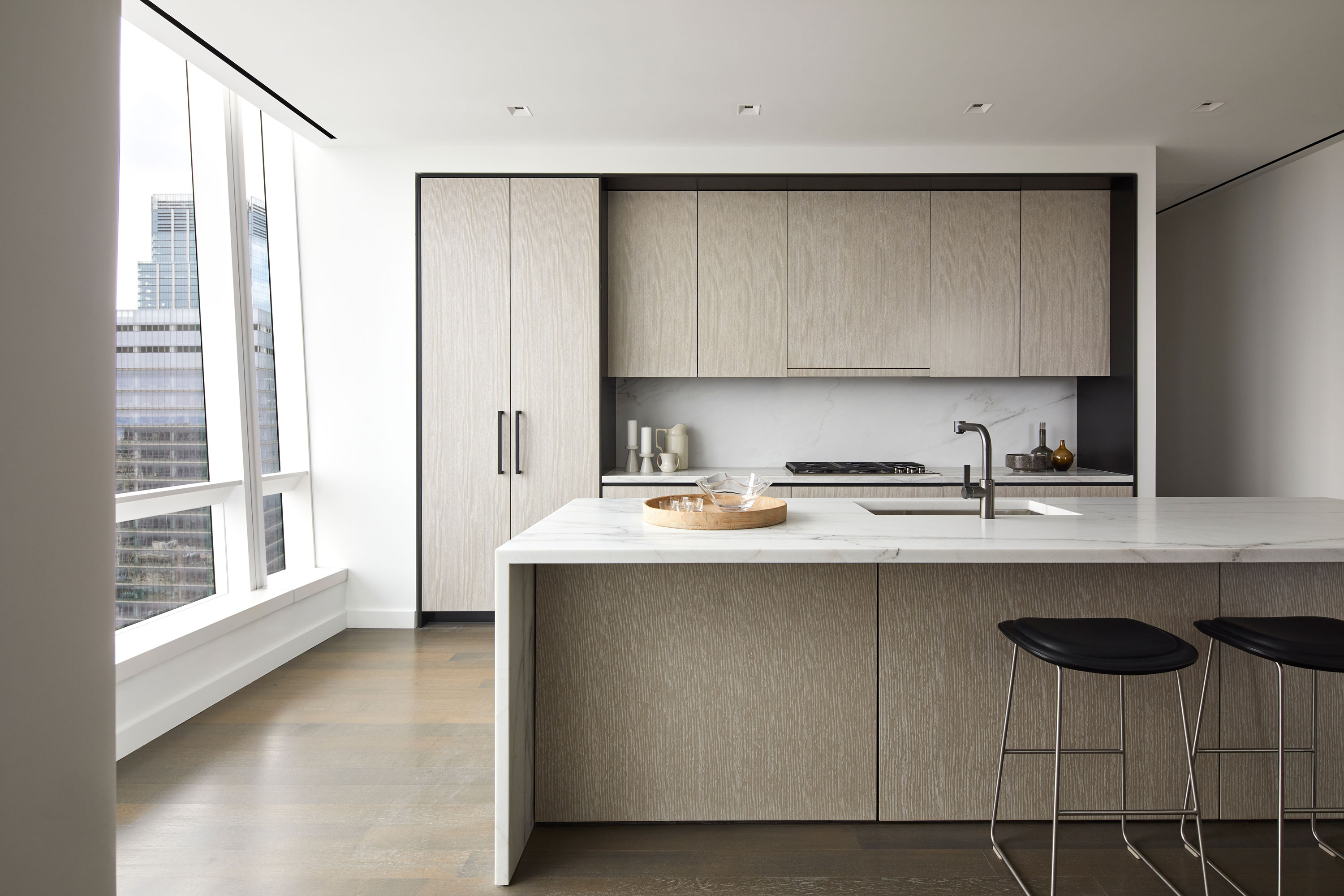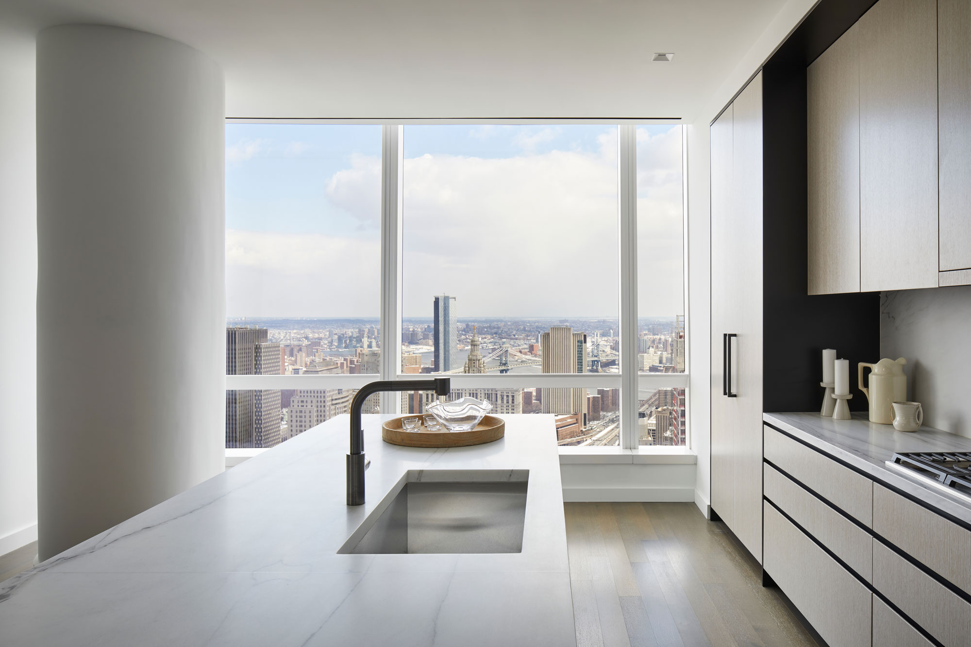 Offering expansive north, south and east facing panoramic city views, 59East boasts ceiling heights of over 11 feet, a private elevator vestibule, eat-in kitchen with an entire wall of floor-to-ceiling windows, center island breakfast bar and dual points of entry. The apartment also includes a custom Dada kitchen with cerused White Oak cabinetry trimmed in custom soft black metal.